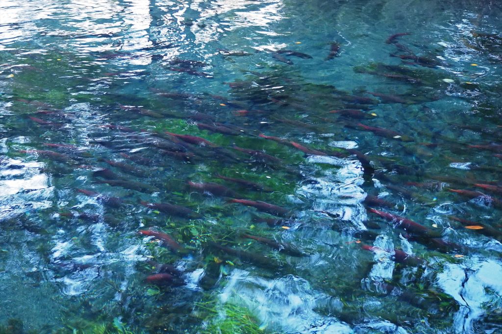 産卵のために遡上してきた、ヒメマスの大群!! 婚姻色の赤が目に鮮やかです。