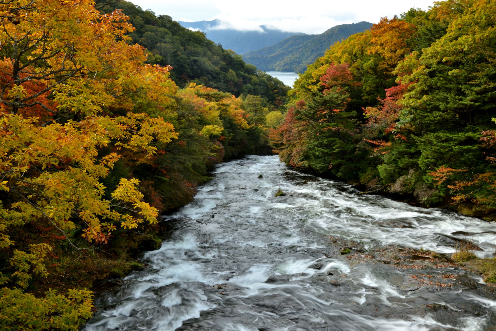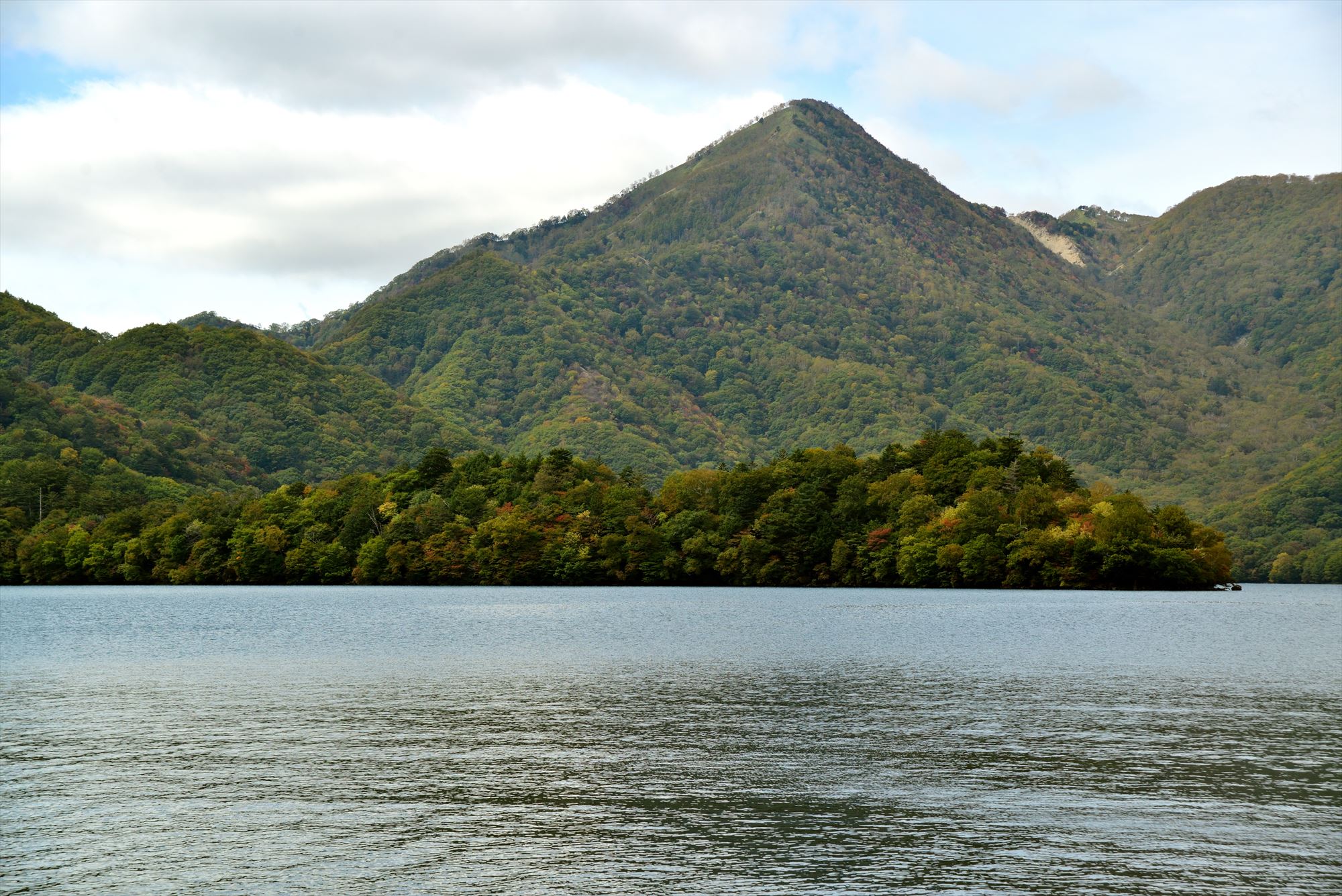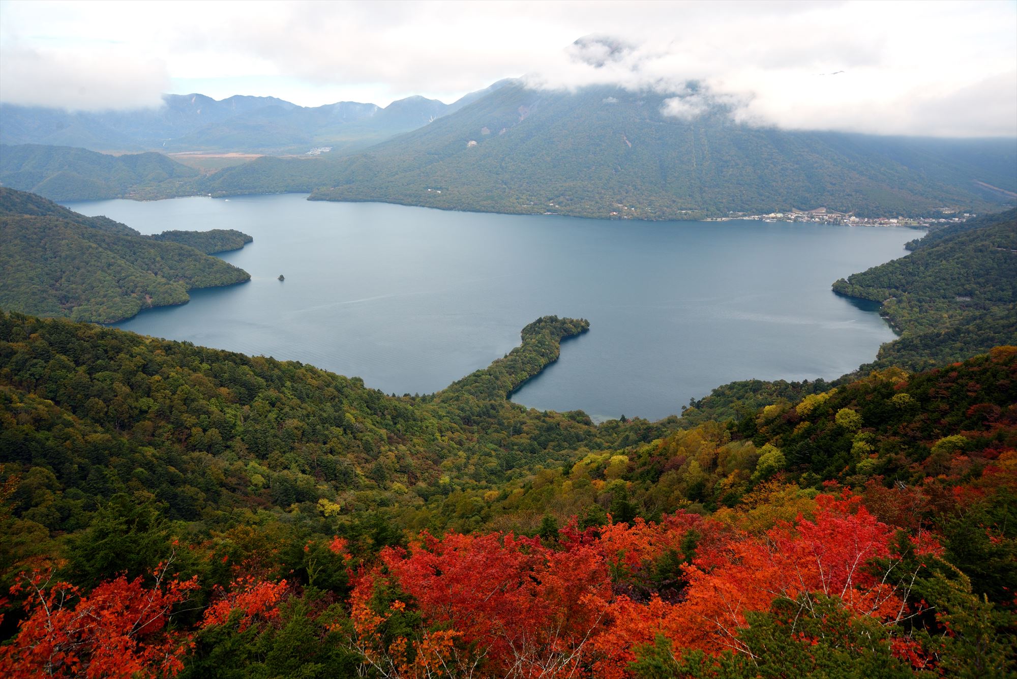 裾野の方の中禅寺湖畔はというと、紅葉の名所八丁出島は色づき始め。