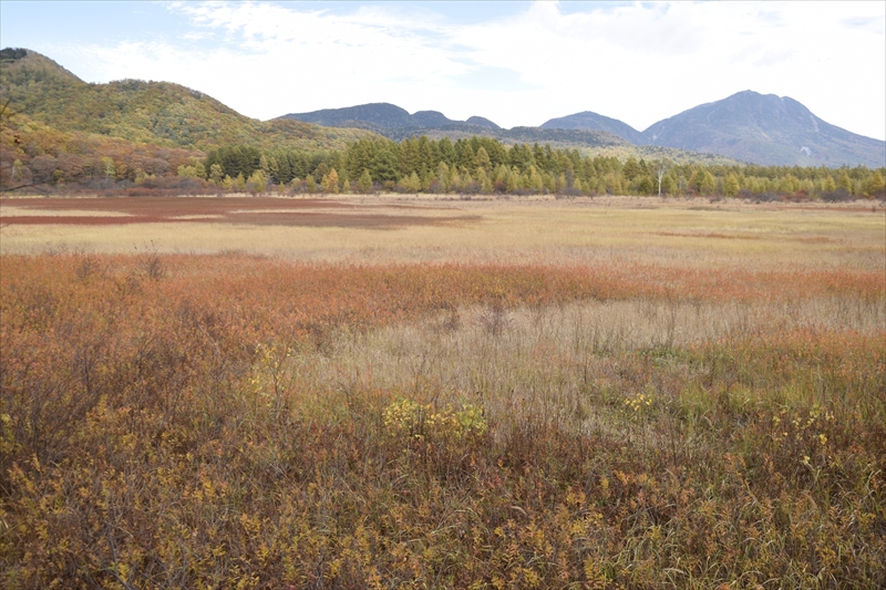 【小田代原】周囲の山の木々が見頃!草紅葉がまだ見頃!(同じホザキシモツケなのに、紅葉が真っ赤なのとオレンジなのがあって不思議・・・それがとてもきれいでした!)カラマツの林も黄色に色づいてきていました。
