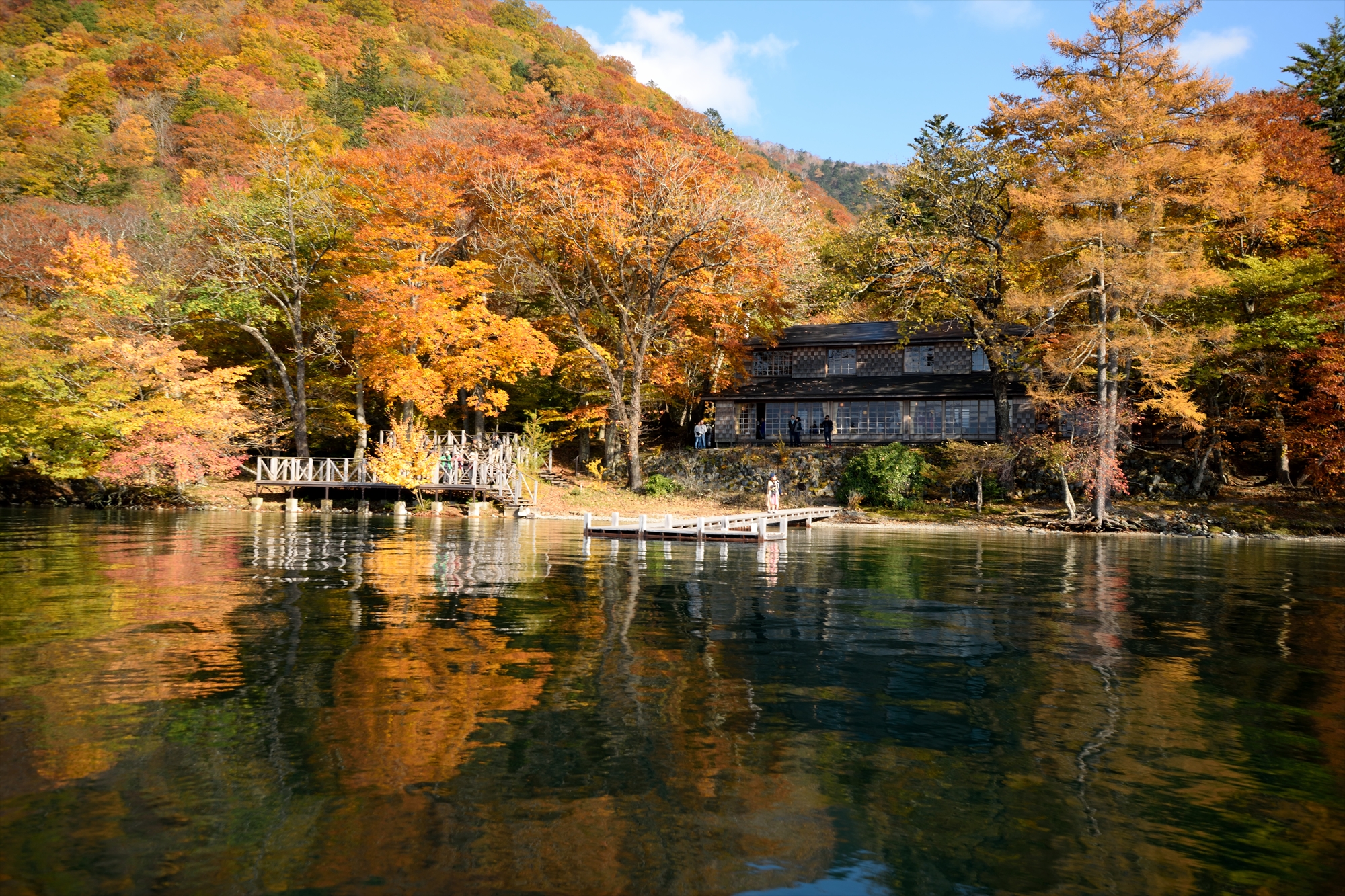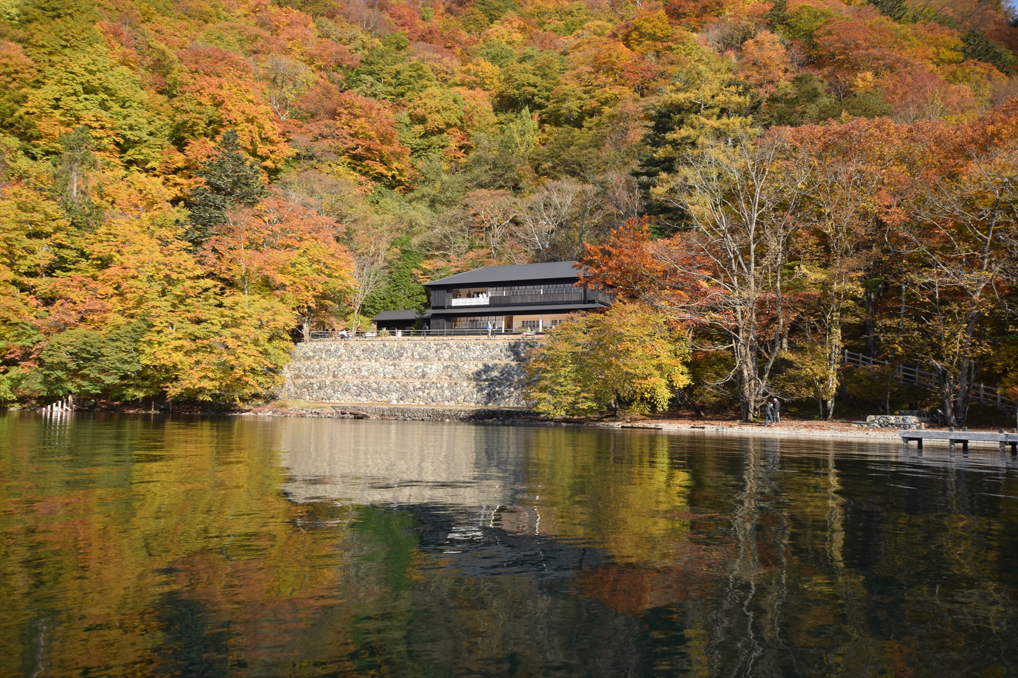 湖面に映る紅葉と建物がなんとも言えませんね~! お散歩するのもおすすめですよ♪