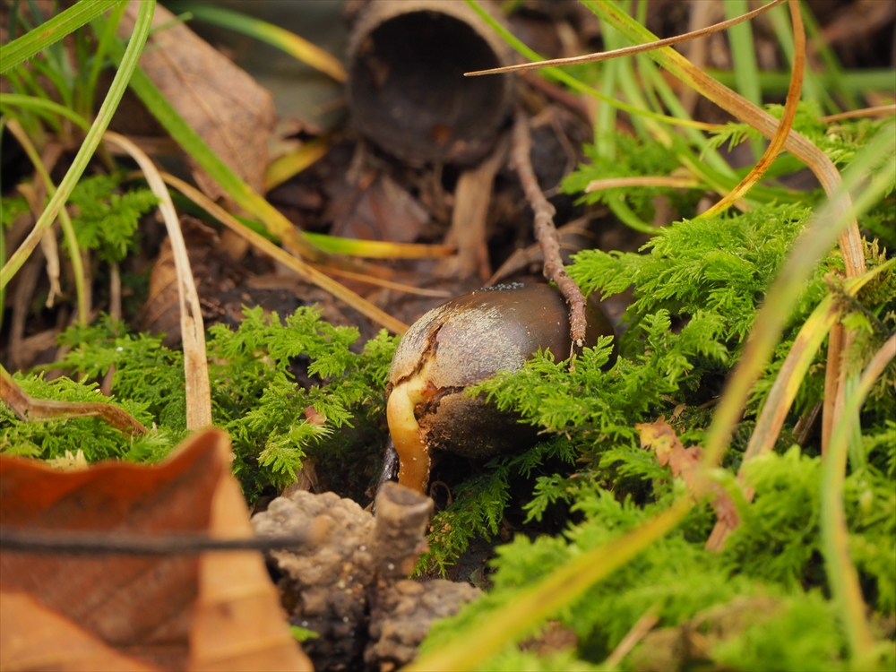殻を割って飛び出している、柔らかそうな白いものは、ドングリ(コナラ)の根っこ!
