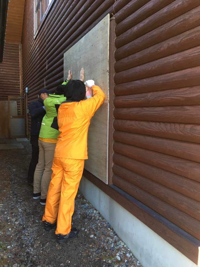 大方、中の片付けが終わったら窓にベニや板を打ち付けます。