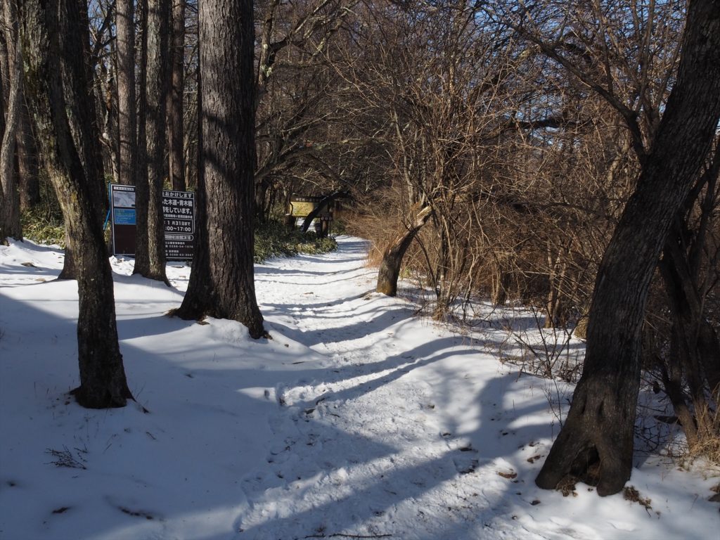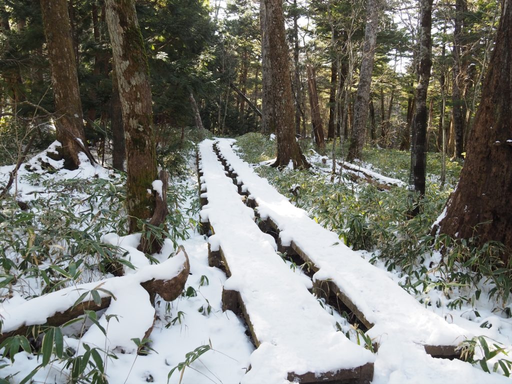 木道の下は深くて10cmほど積もっていて、木道上は踏み固められた雪のせいで滑りやすいです。