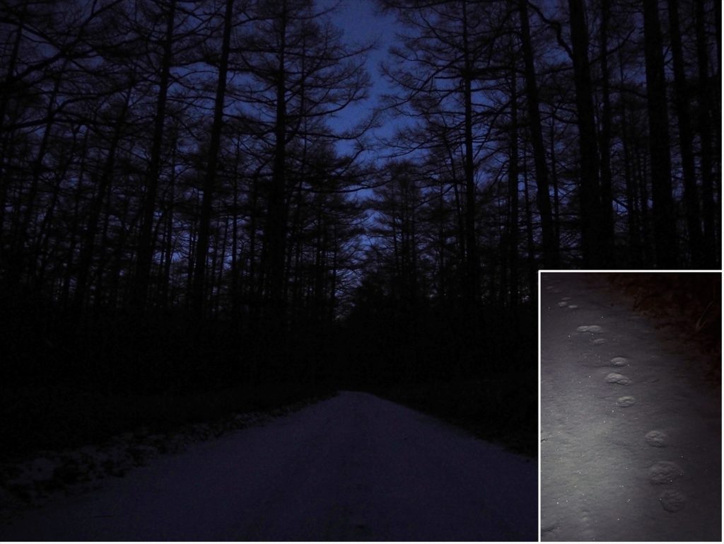 積雪が少なく歩きやすいのが長所です。しかし人工の道だからと言ってあなどってはいけません。足元にはキツネらしき足跡が、白み始めた空には木星も輝いていました。