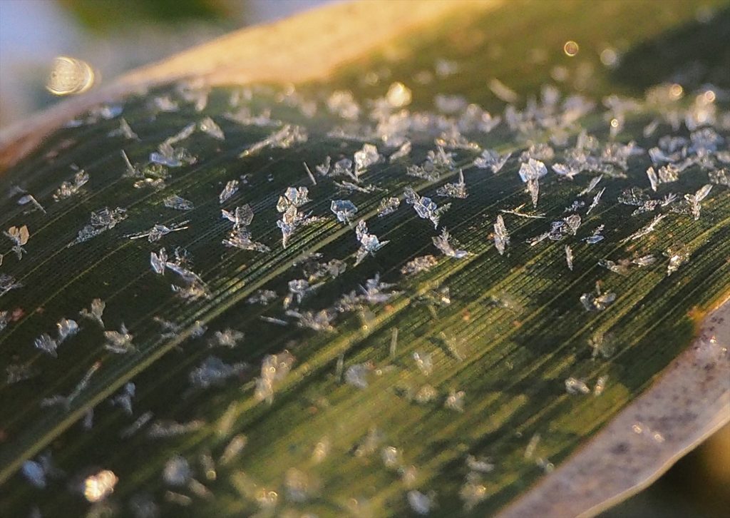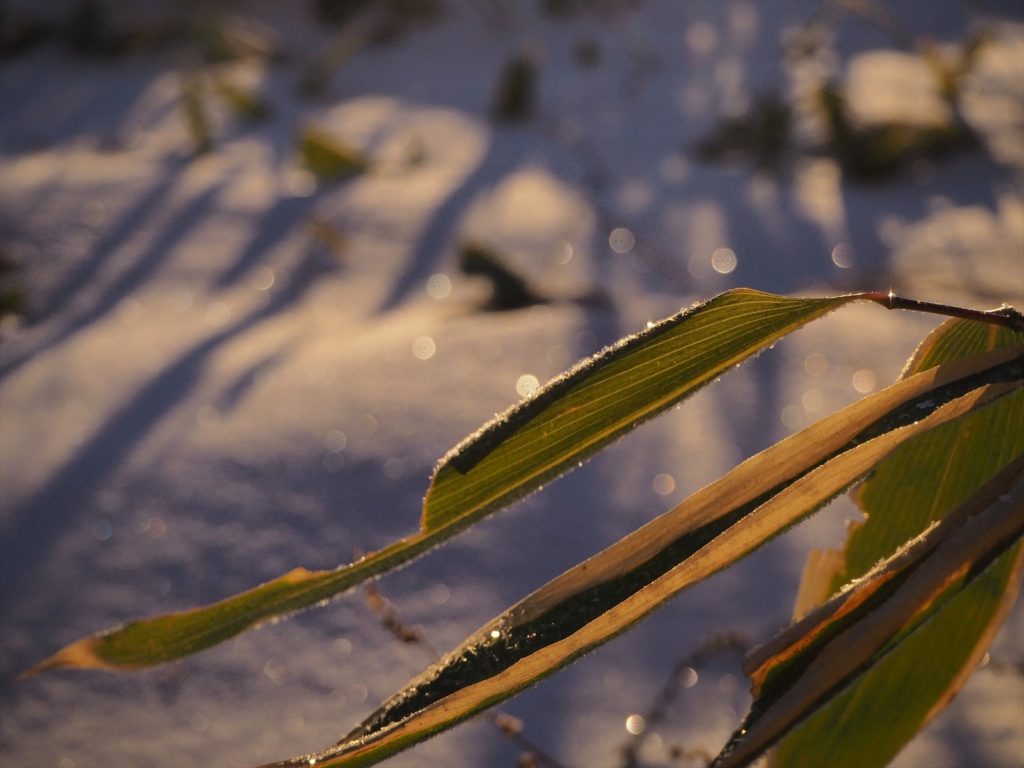 よーく見てみると、ミヤコザサの表面に、針の形や六角形、雪の結晶のような六花型の霜が降りて、陽光を反射してキラキラと輝いていました。