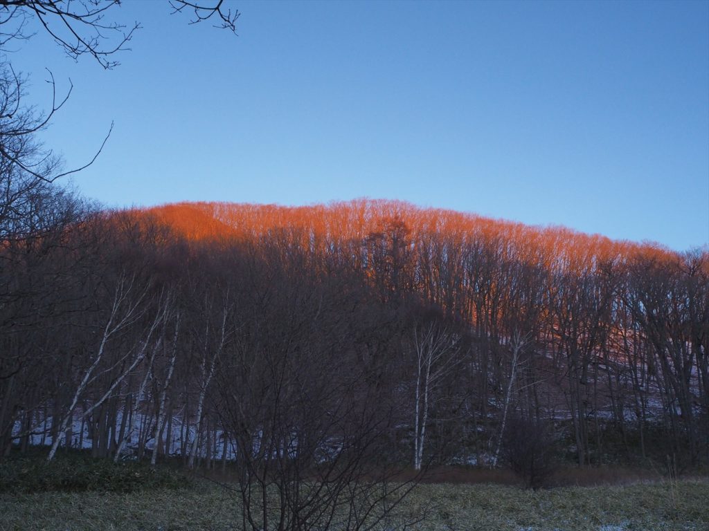 あわてて振り返ってみると、カラマツやミズナラ、シラカバの林が、まるで朱墨をかけられたかのように上からあっという間に染まっていきました。