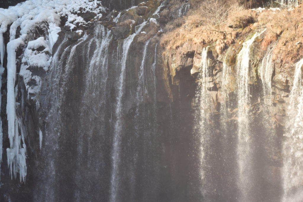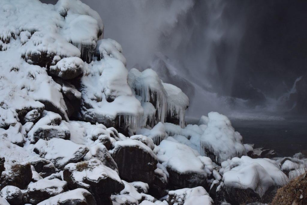 滝壺の近くの岩場は雪が残っていて、その雪にはツララができています!