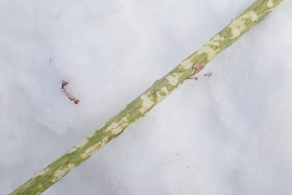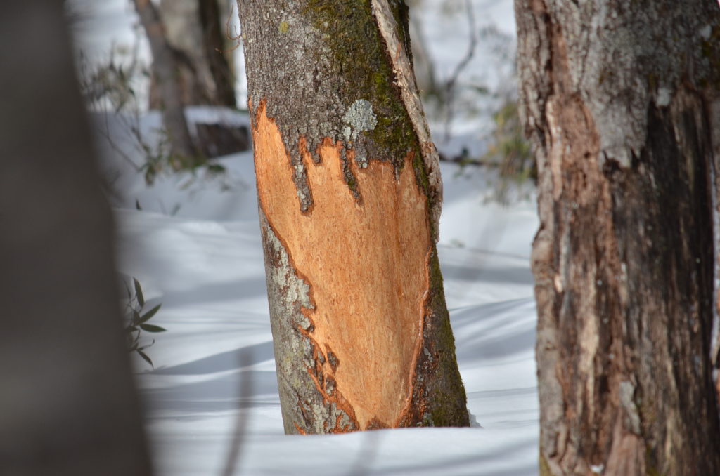 シカの樹皮剥ぎの跡とサルが齧った後の枝