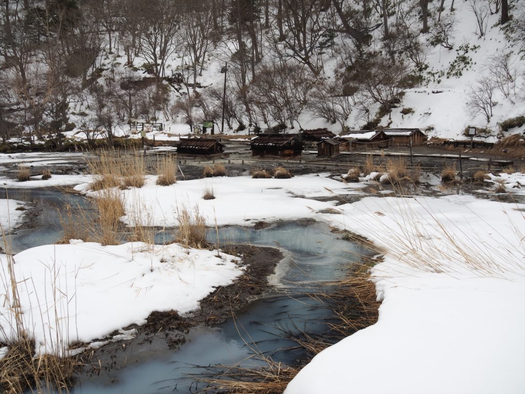 なんだか癖になりそうな硫黄の匂いを嗅ぎながら雪で埋もれたササっ原の階段を上がっていきます。