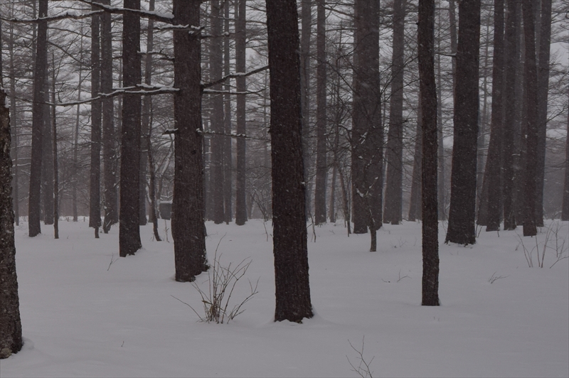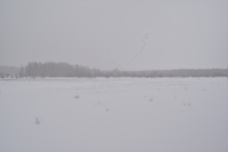 真っ白な小田代原と周囲の景色を見るのを期待していたのですが、吹雪が強くなってきて、周囲が白く、見えにくくなってしまいました。顔に当たる雪が痛く、冬の厳しさを実感しました。