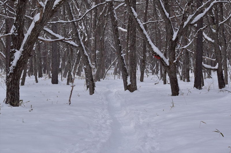 歩いた1月24日は、木道上には多い所で4、50cm雪が積もっていました。先日降った雪はまだサラサラふかふかで、踏むと多い所で20cmくらい沈みます。すでに先に入った方がおり、コース上はスノーシューの踏み跡がずっとついていました。スノーブーツで踏んでも沈みませんでしたが、スノーシューで歩いた方が歩きやすい状況でした。