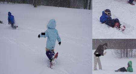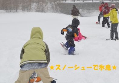 面白い会話形式の準備体操の後に、スノーシューじゃんけんやかけっこ、鬼ごっこ、滑り台を滑りました。