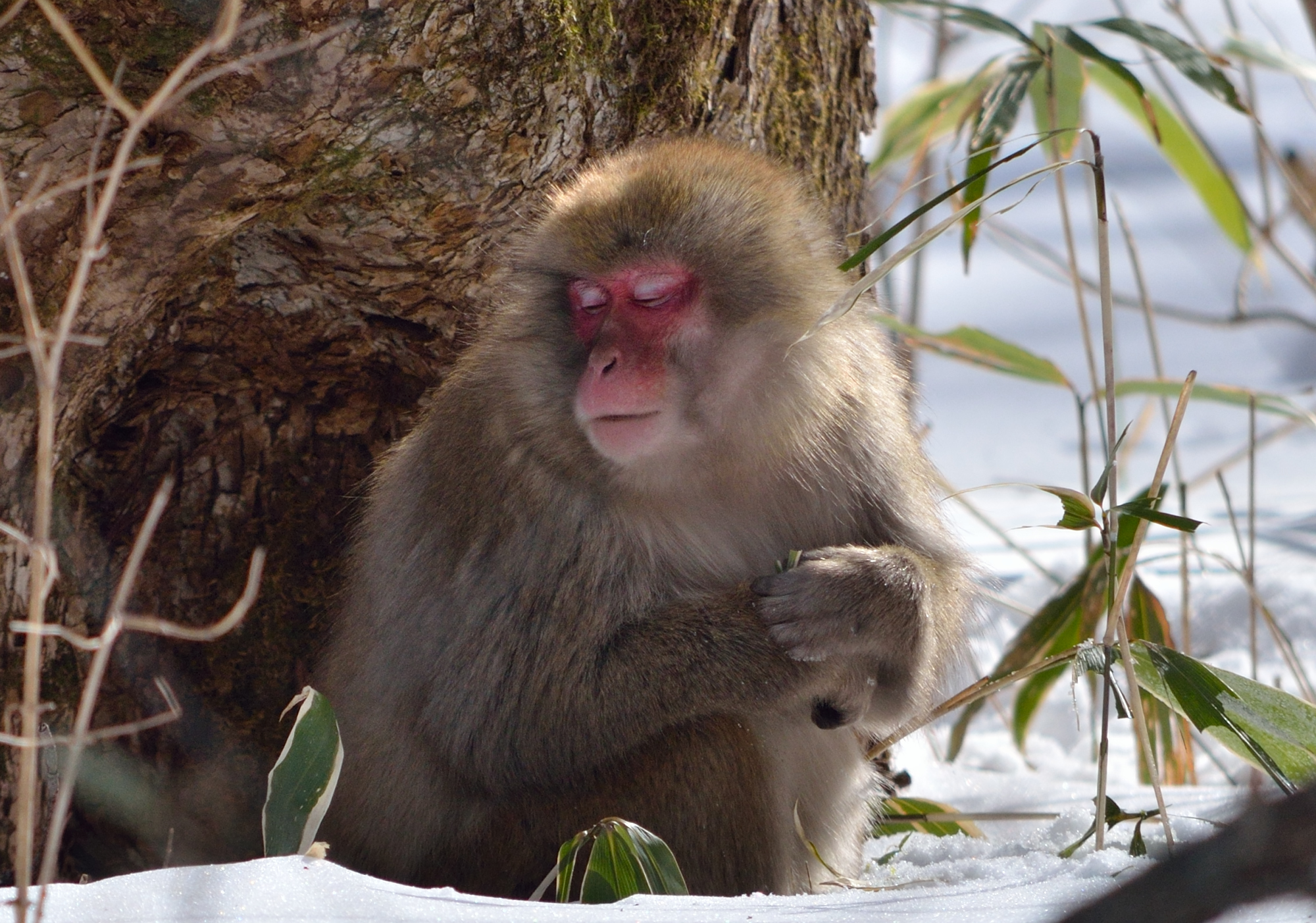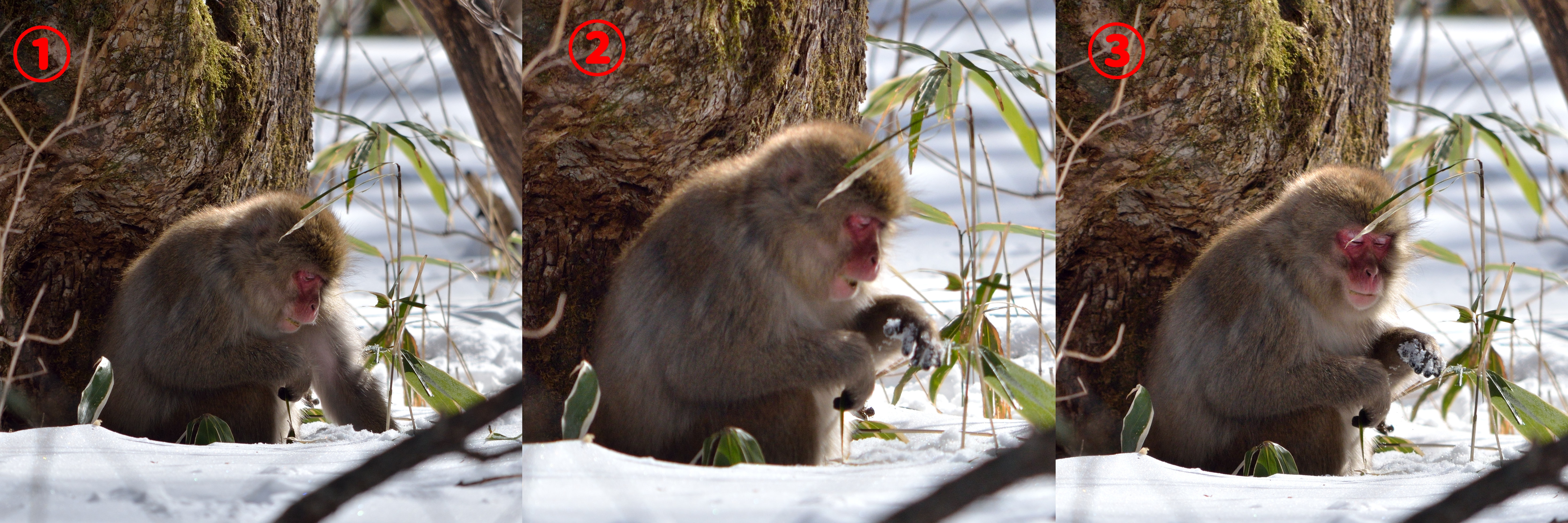 殆どのサルが高い木の上にいましたが、一匹だけ地面で雪の上には座りたくないのか、木の根元に座って手を伸ばして届く範囲のササをとって食べていました。