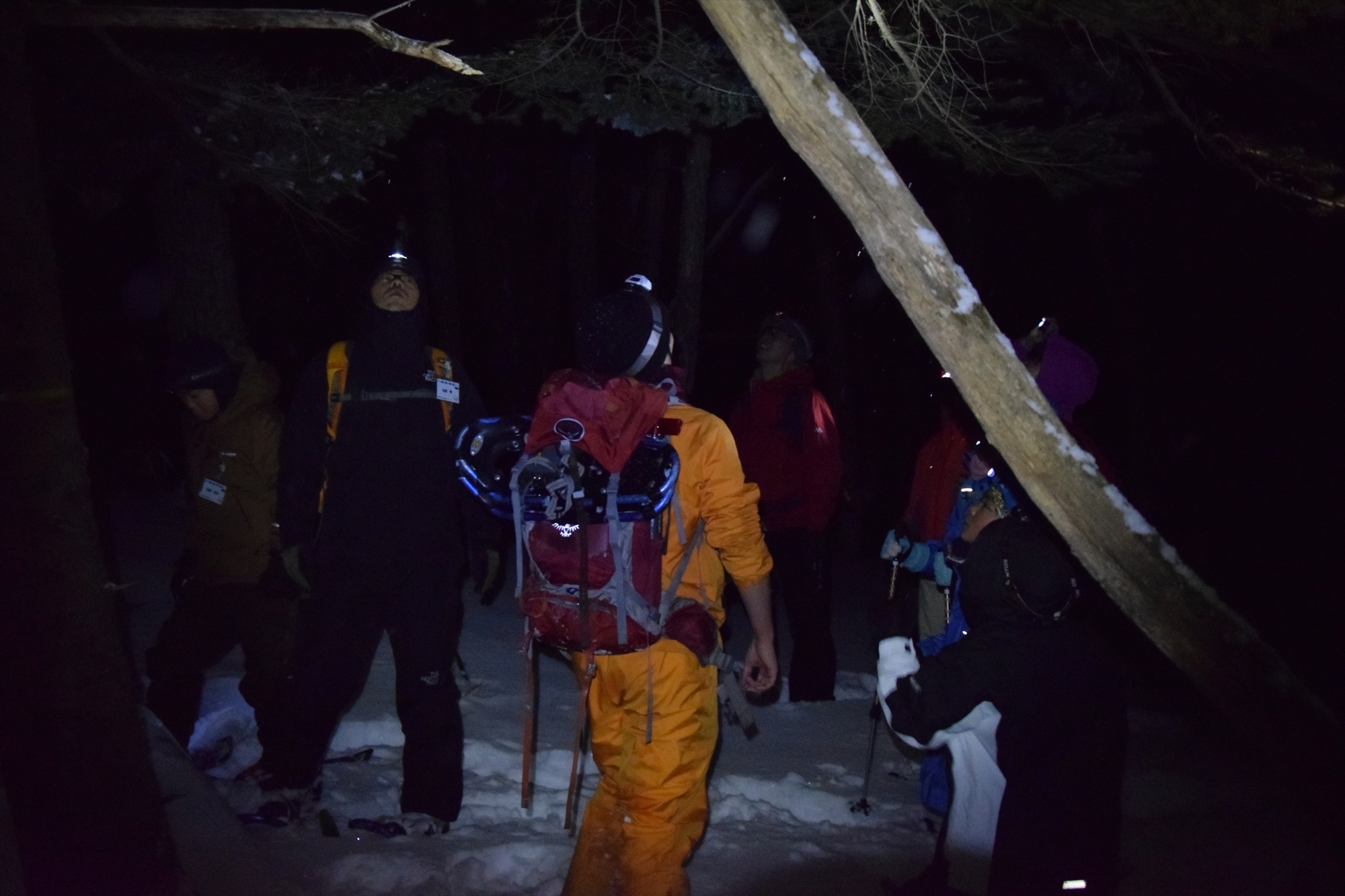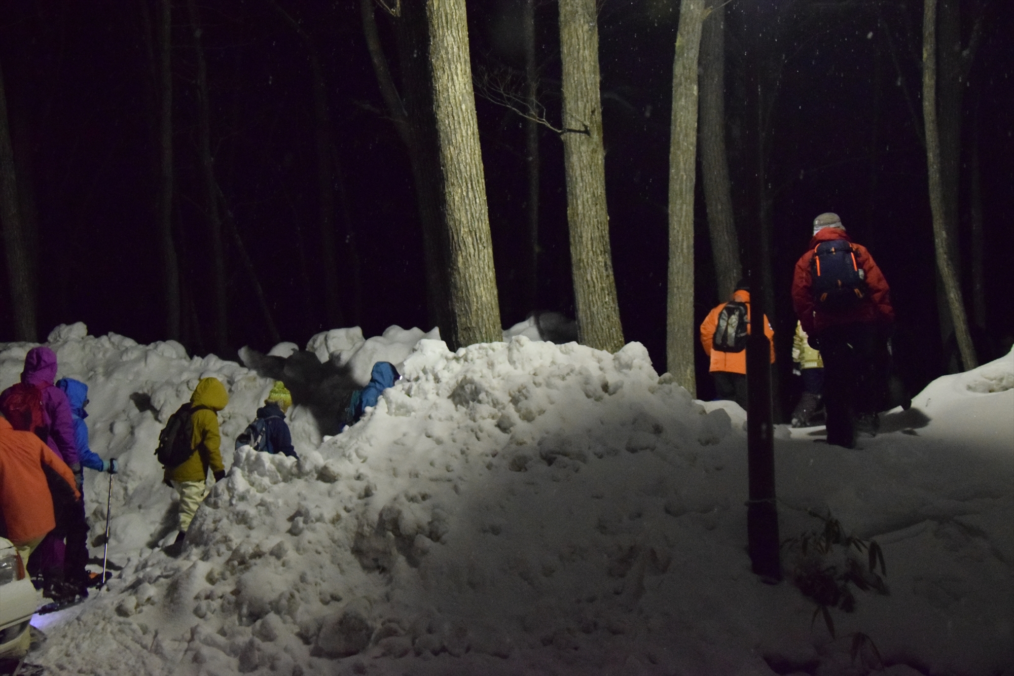 実は白い雪は暗闇の中でよく目立ち、周りの木々や私たちがシルエットのように浮き上がるので、意外にライトなしでも歩けてしまうのです。