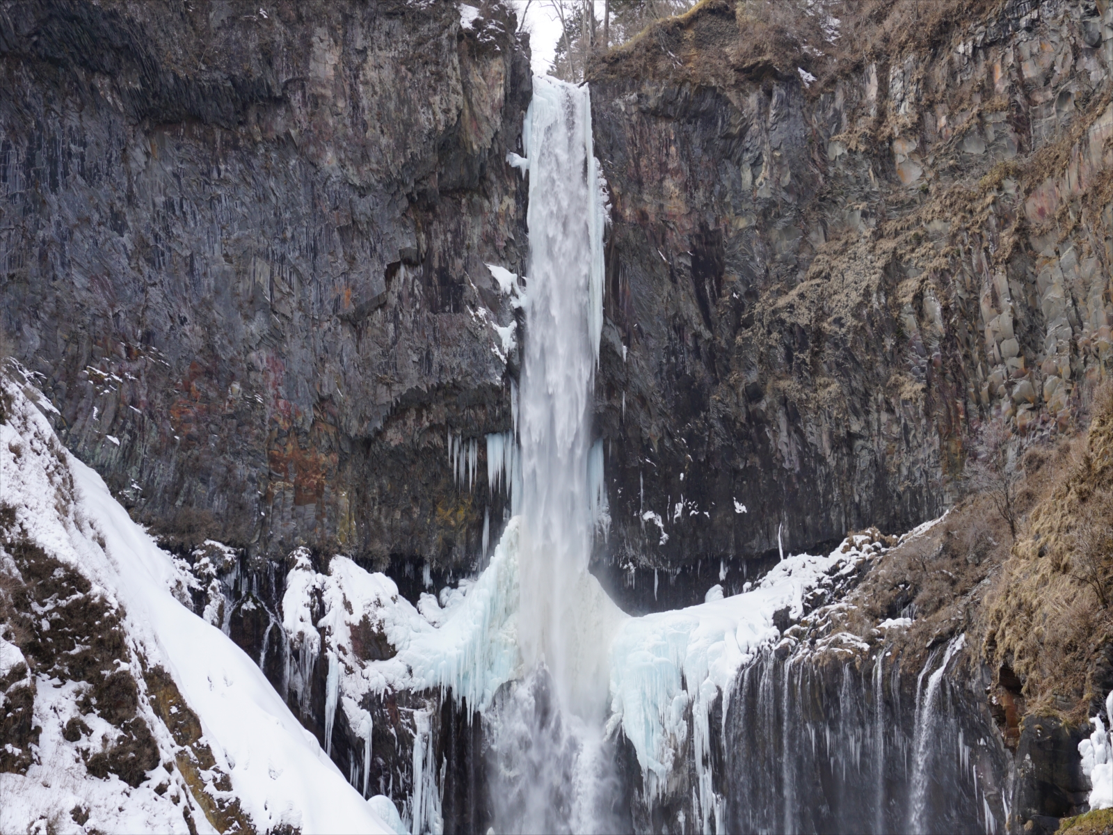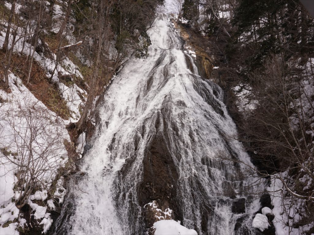 メインの滝は勢いよく流れています。滝の真ん中の裏側が凍っていてまるで、滝の裏側に小さな富士山があるようです。