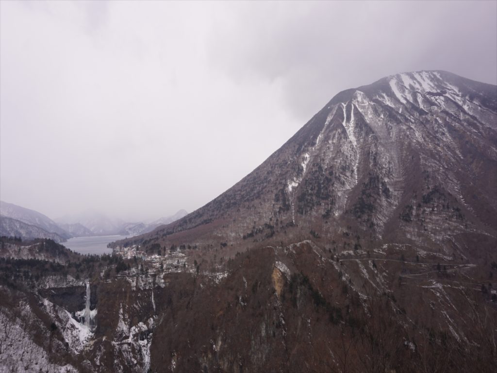 右手に白くお化粧している男体山、正面に中禅寺湖、そこから流れ落ちる華厳滝。