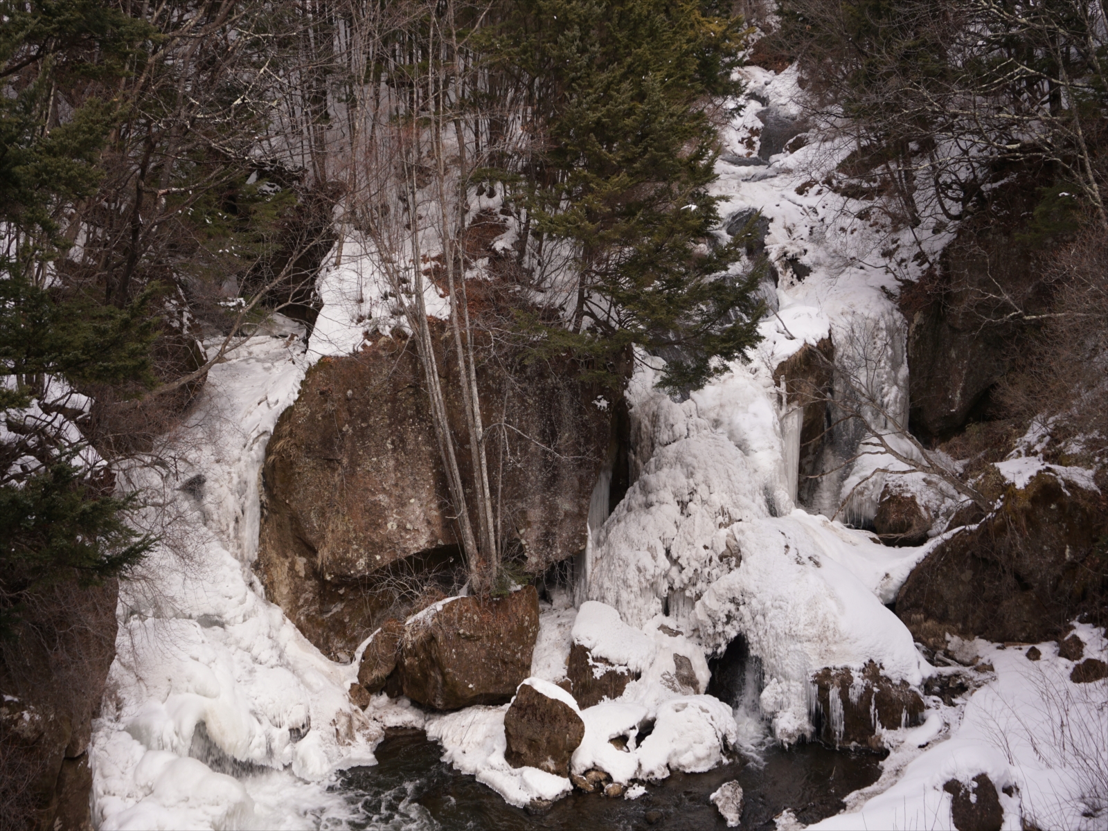 こちらもナメ型の滝です。滝の表面が凍っていて、氷のトンネルの中を滝が流れています。面白いですね!