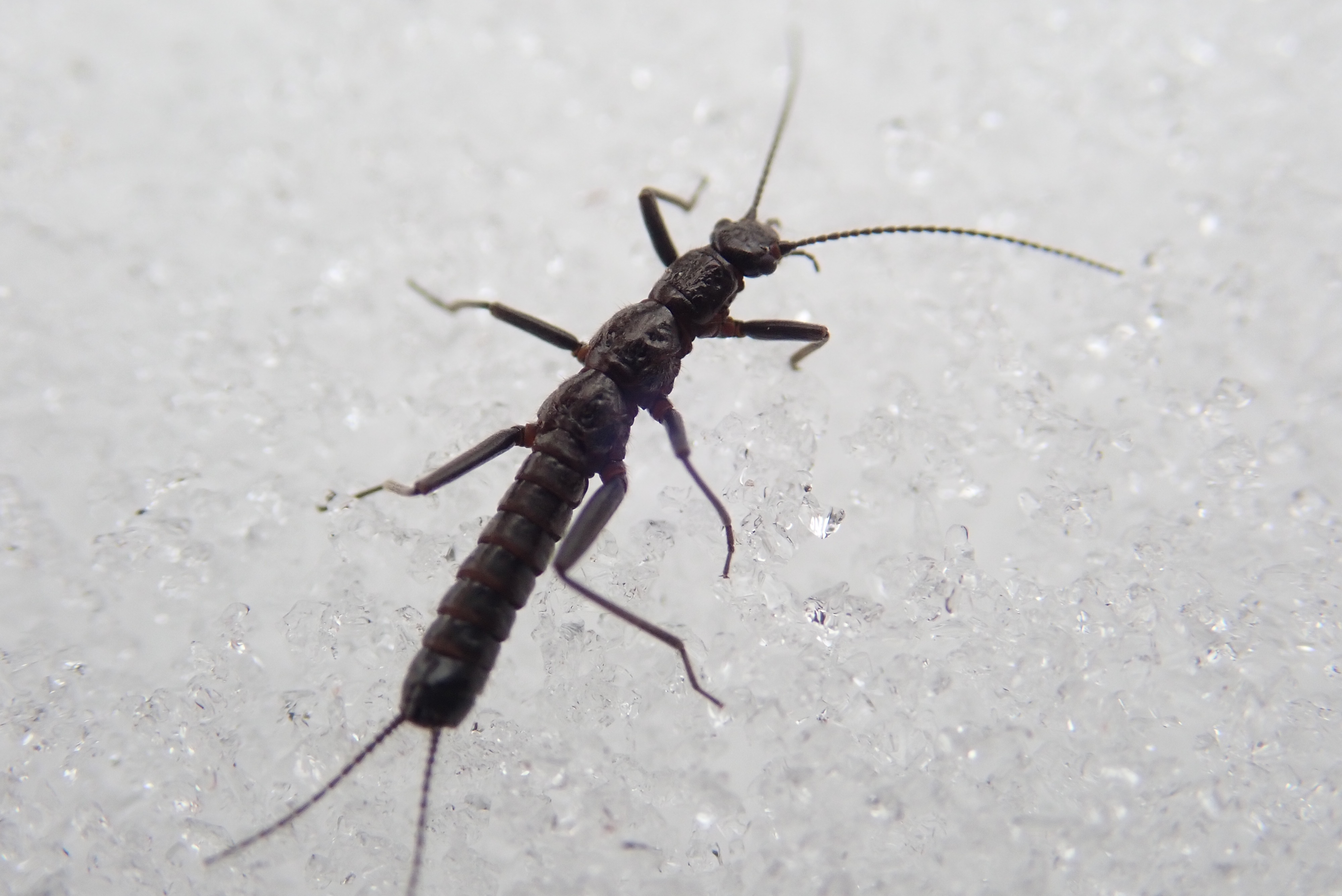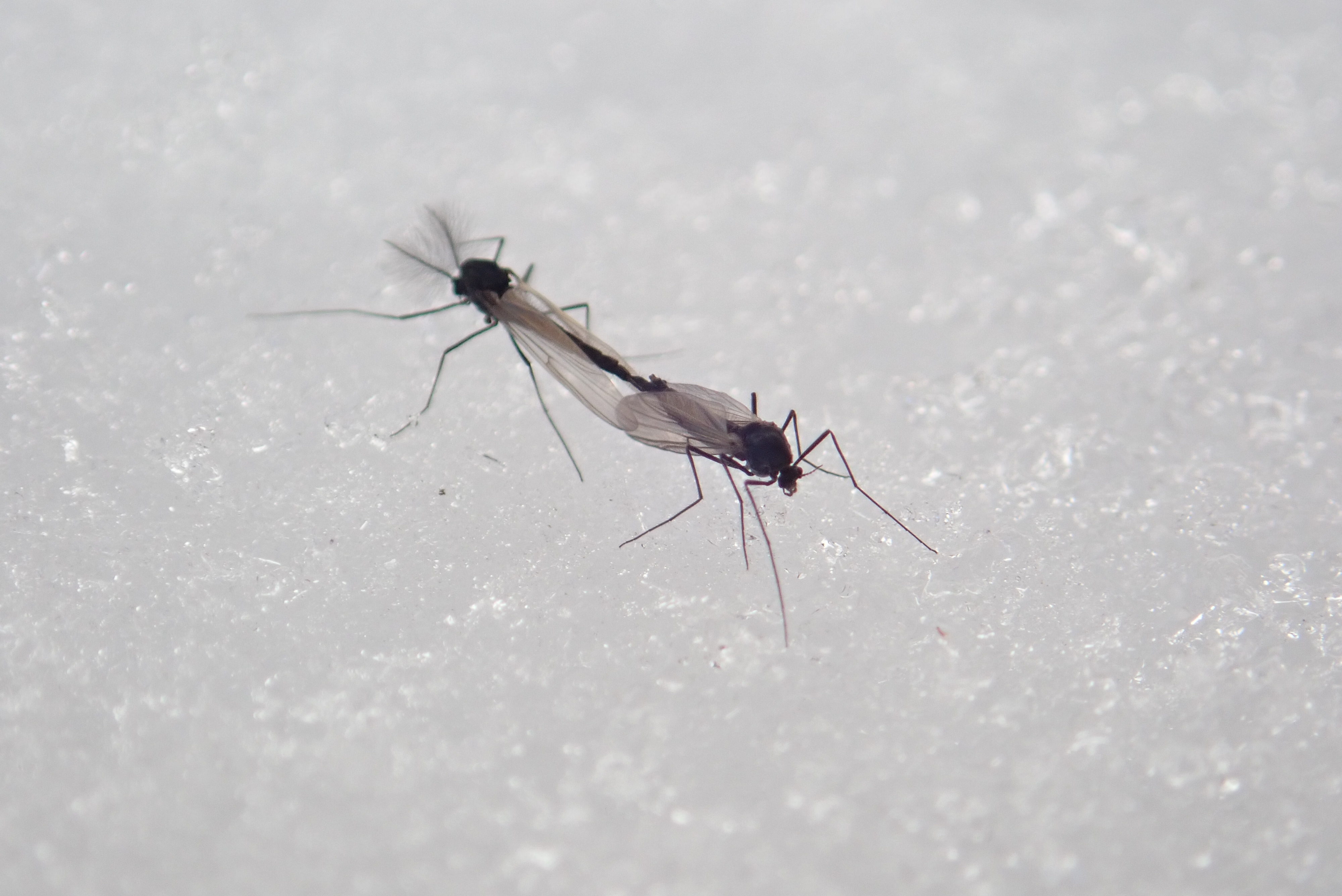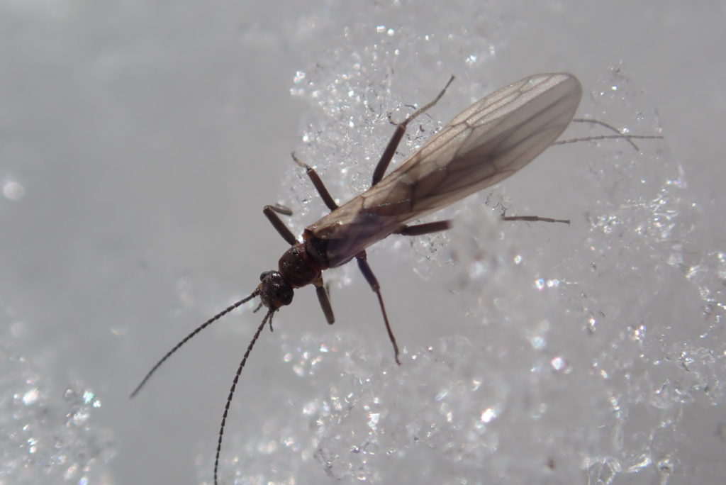 小さな虫ですが、白い雪の上では黒い体色が目立つことに加えてよく動くので簡単に見つかります。