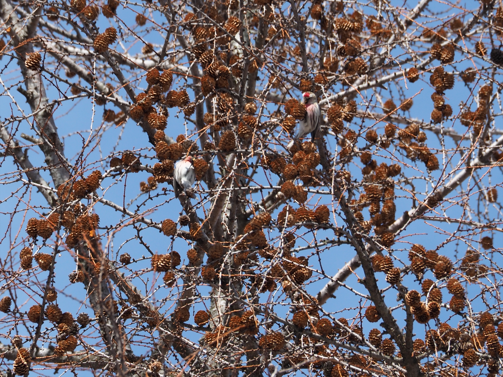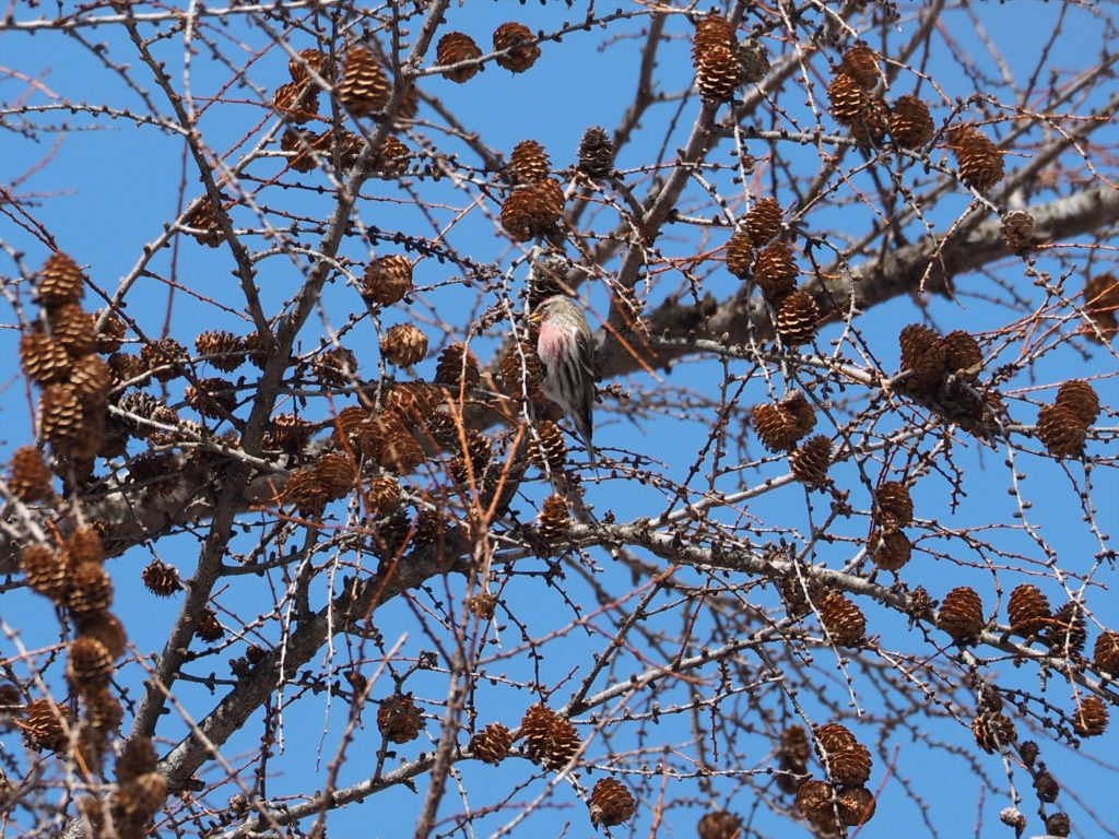 10羽ほどの群れでせわしなく、枝に残っているカラ松ぼっくりにくちばしを突っ込みお食事中でした。