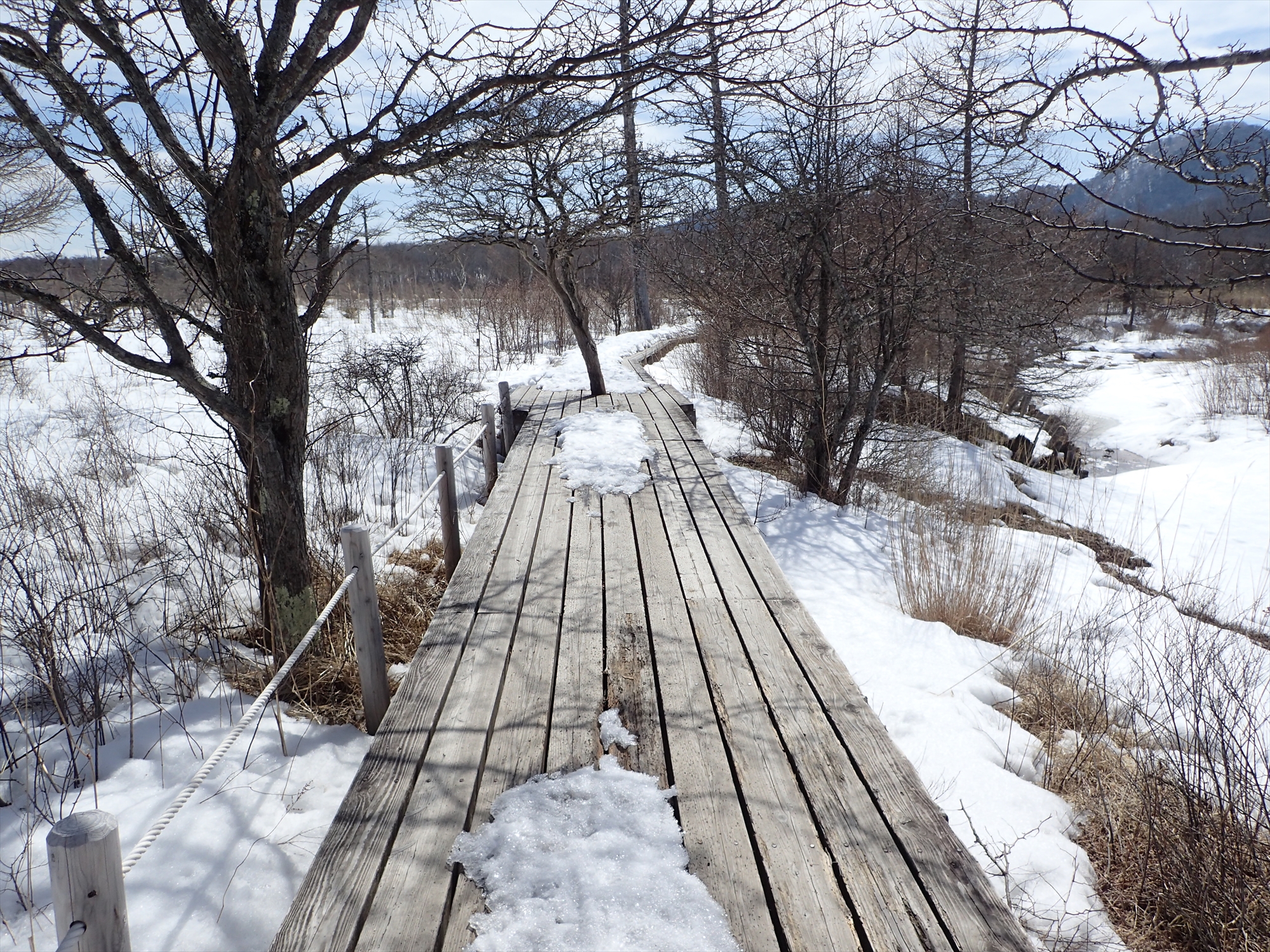 また、日当たりが良い部分では溶けて木道が露出している箇所が見られ、そこにスノーシューなどの刃が当たって傷んでいました。