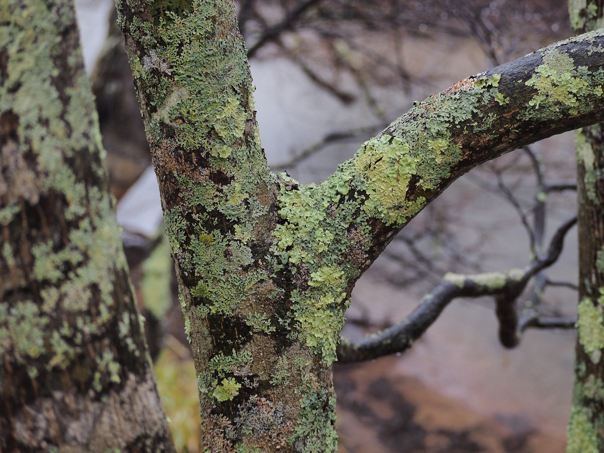 木の幹に注意を向けると、菌類や藻類の仲間である地衣類の薄緑色が目立っています。