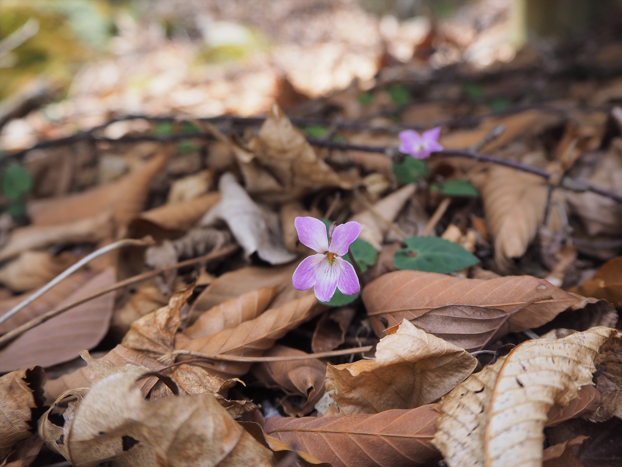 足元では、可憐なフジスミレが盛りを迎えていました。名前の由来になったという、花びらの藤色が、落ち葉のなかで目を引きます。