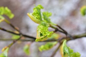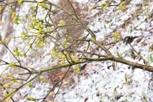 葉がまだない枝先をよく観察してみるとなにやら緑色をした尻尾のようなものが・・・。