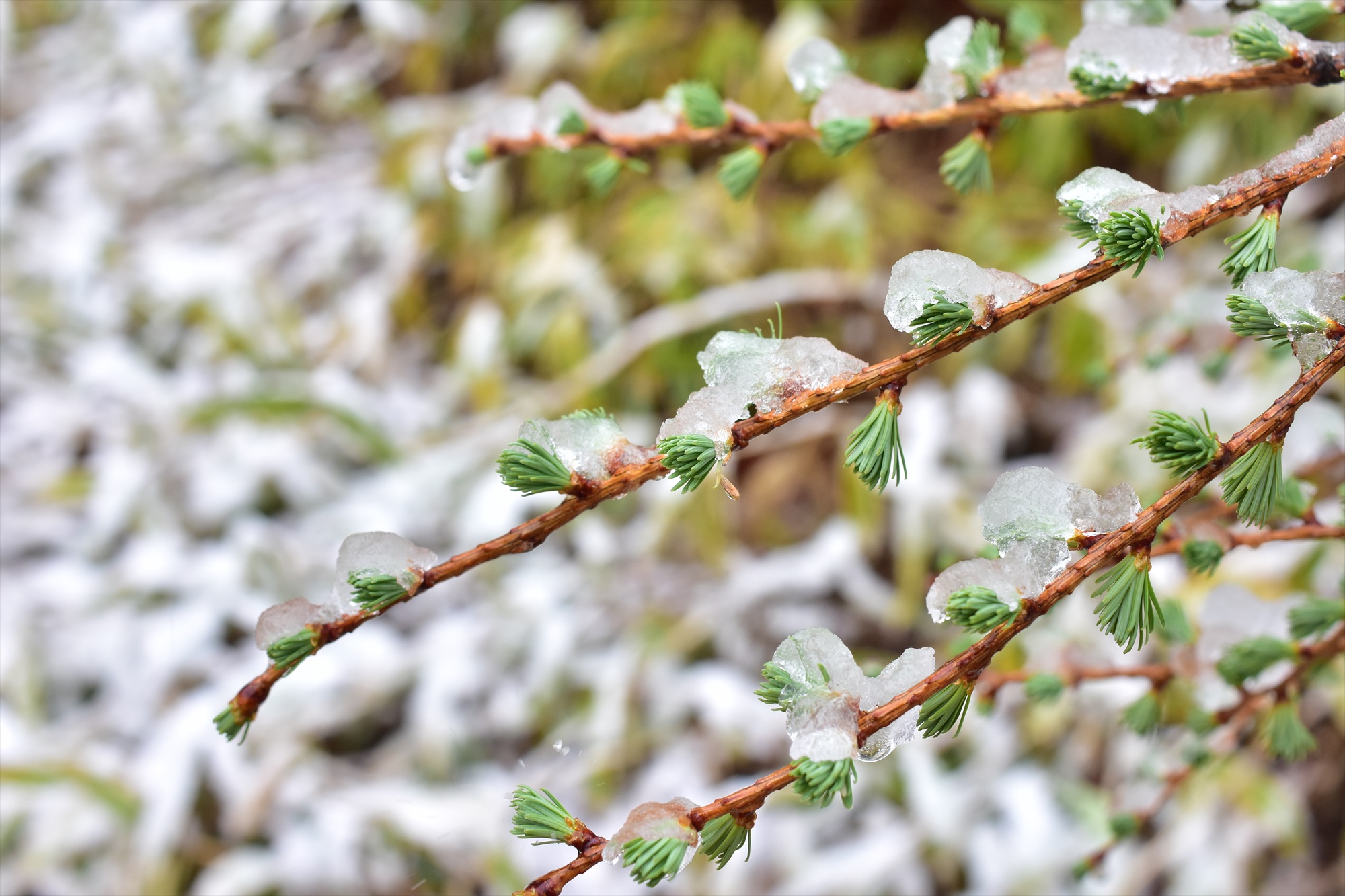ですが、そのおかげでカラマツの芽吹きが氷に包まれた不思議な光景を見ることが出来ました。