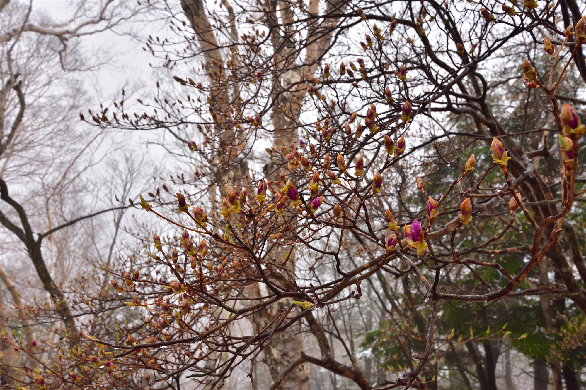 山頂直下には前回ご紹介したトウゴクミツバツツジという紫色のツツジが多いのですが、時期が早いせいかつぼみ多数。