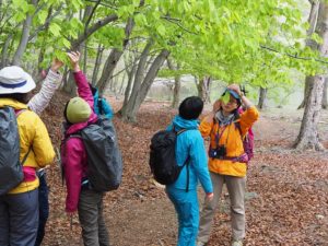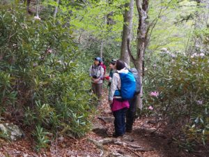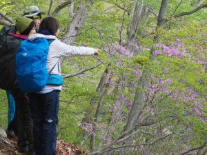 阿世潟からは、自然解説員がイチオシのモノ・コトをご紹介しながらトレッキング開始です。ちょうど見頃を迎えていたトウゴクミツバツツジや、アズマシャクナゲに囲まれた道を通れるという贅沢!