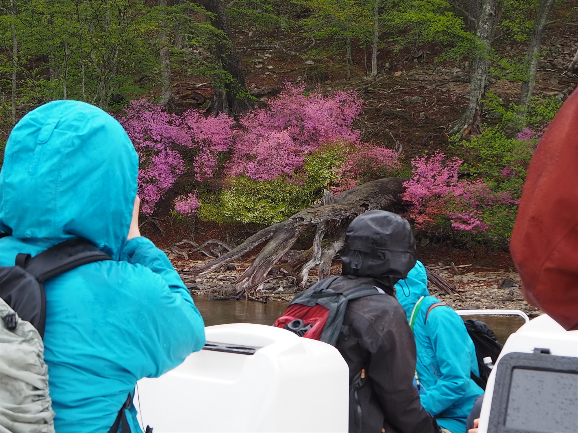 帰りのボートでは、北岸のトウゴクミツバツツジに湖側からアプローチ!