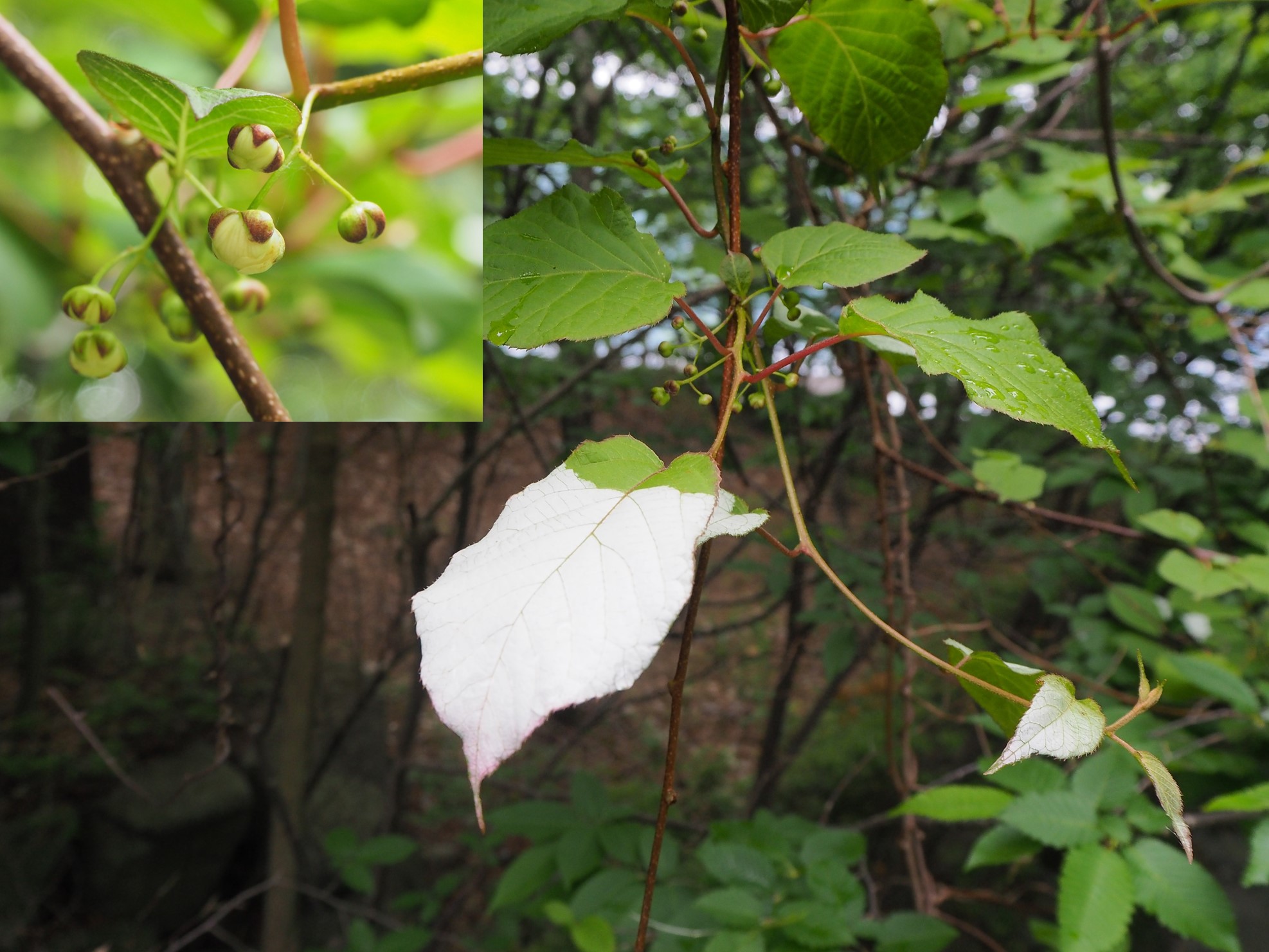 ミヤママタタビの葉が白くなり、開花がもうじきだということを虫に教えてくれていました。