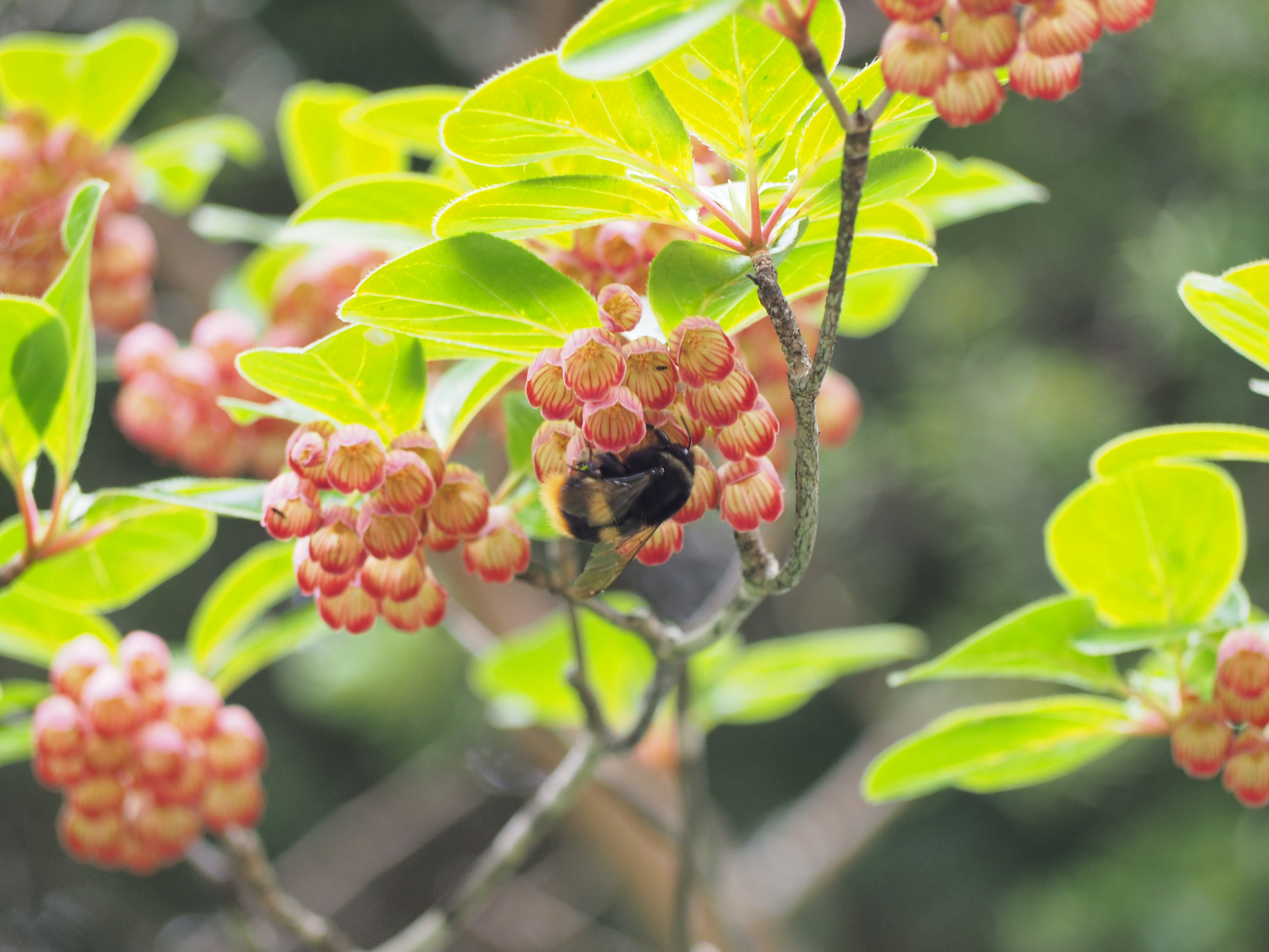 鈴なりに開いた花々には、マルハナバチなどのミツバチをはじめとしたたくさんの虫たちがせわしなく飛び回って、夢中で頭を突っ込んでいました。
