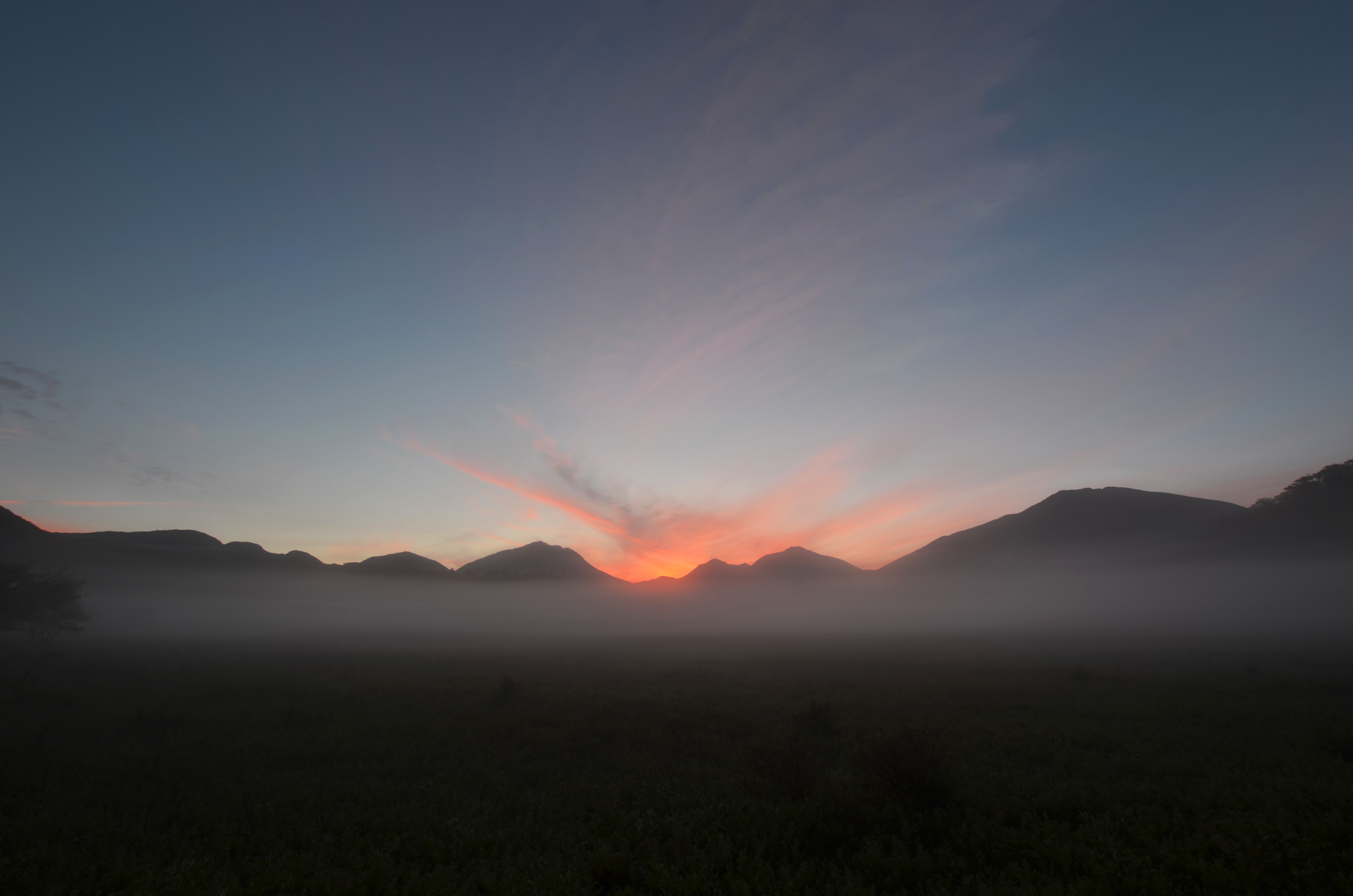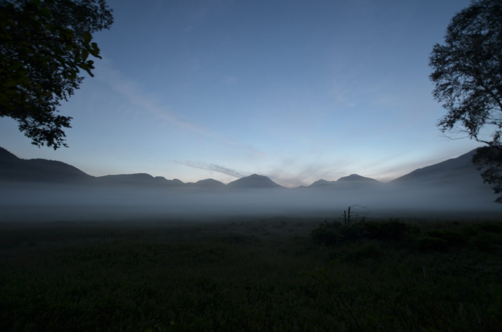 噂に聞く「小田代原の朝もや」。黒々とした日光連山と、小田代原の草原との間に境界線を引いているかのように、白い帯がずっと広がっていました。