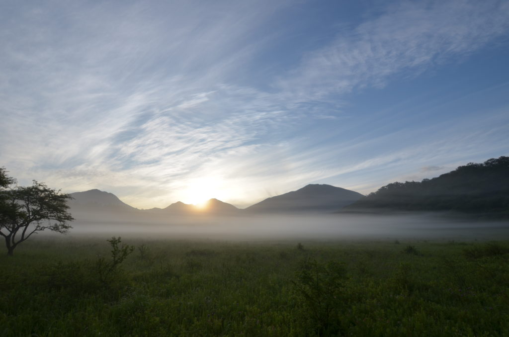 小田代原や戦場ヶ原といった盆地地形では、晴れた風のない夜に地表から熱が逃げる「放射冷却」によって地表が冷やされやすく、水蒸気が霧やもやとして見えるようになることがあります。