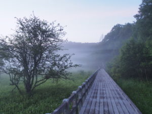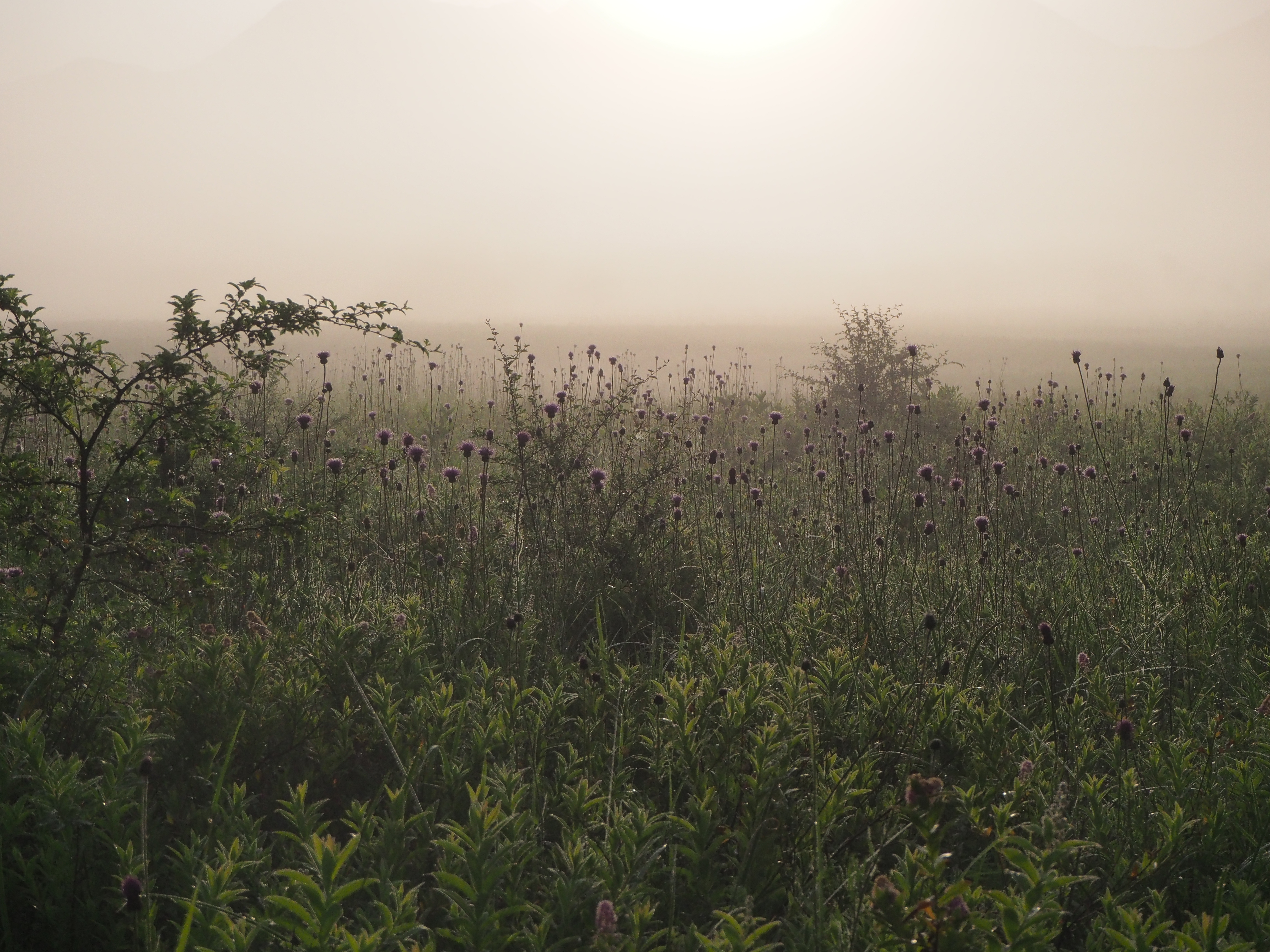 もやが自分たちのいるところにもかかっていたことに気付いたり、幽霊のように佇むノアザミの群落が見え始めたりと、夜明けが進むと共に少しずつ見える範囲が広がっていきます。