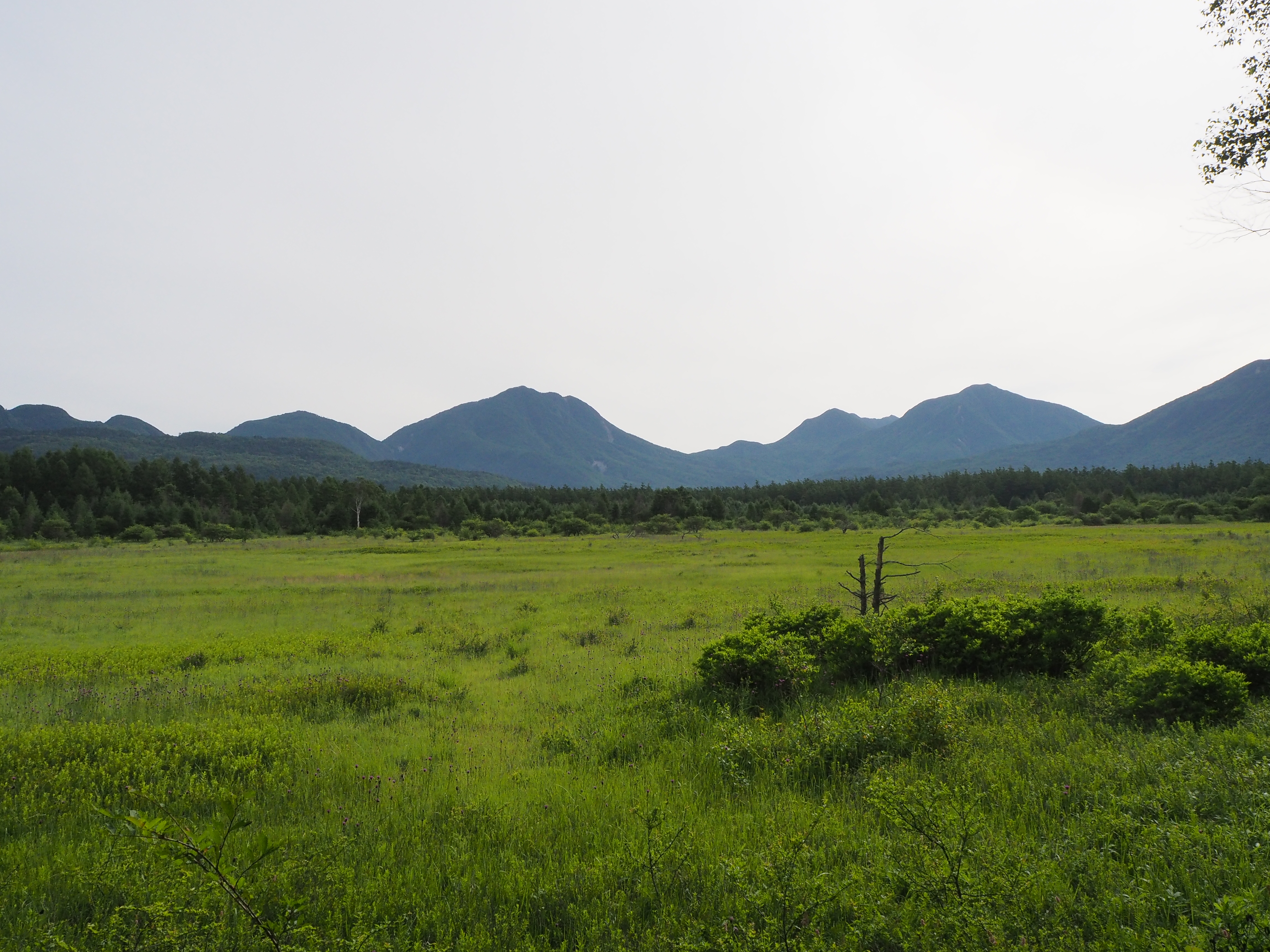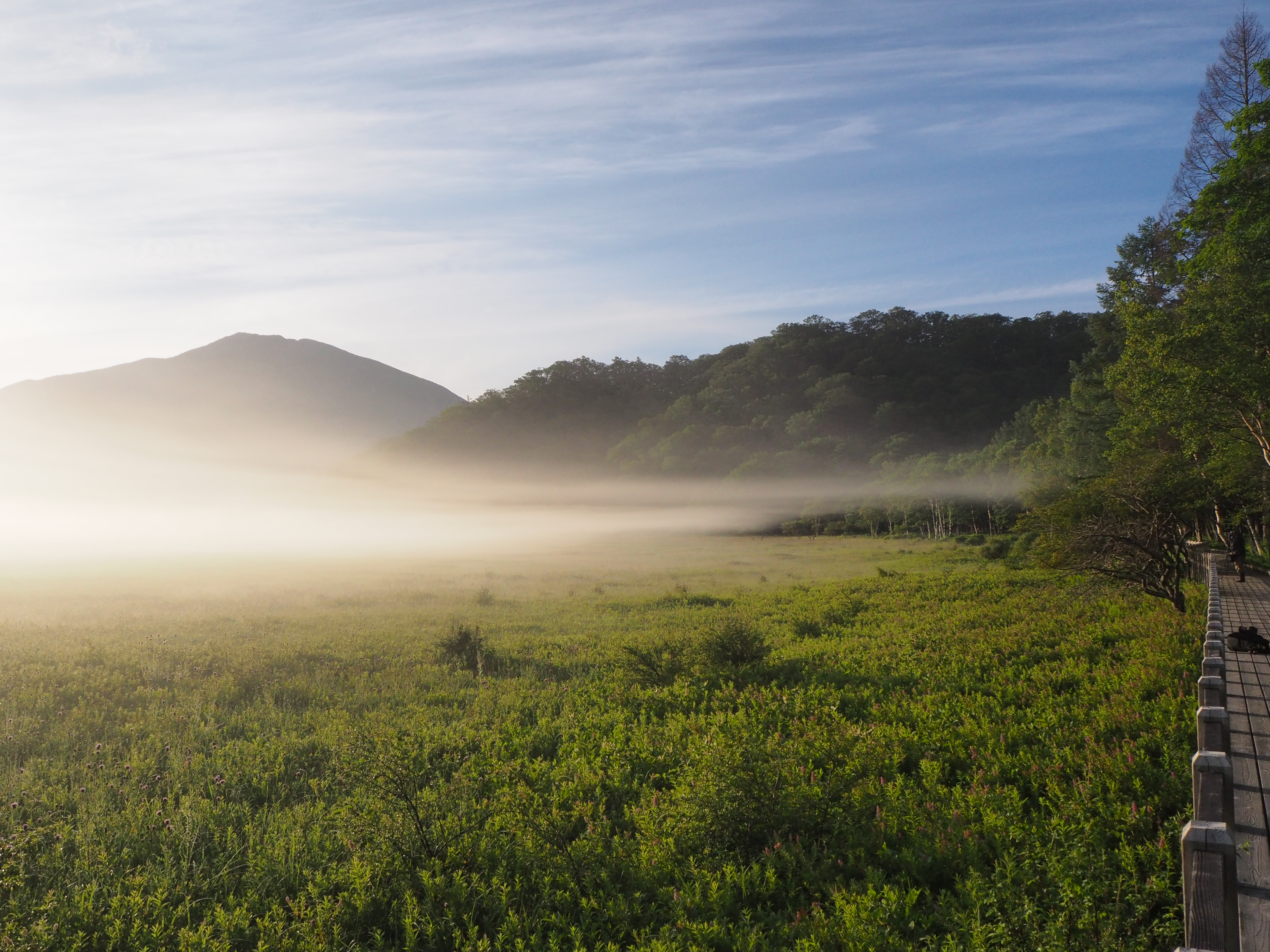 朝日を浴びながら小田代原をゆっくり一周して、夏の花をたっぷり楽しんだあと、展望台に戻ると、朝もやは跡形もなく、草原は生き生きとした鮮やかな緑色を取り戻していました。