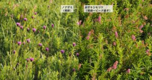 日が昇り始めてからはあっという間に周囲の明るさが増し、雰囲気が一変します。草原の緑、空の青、ノアザミやホザキシモツケも濃い紫やピンクで彩りを添えています。