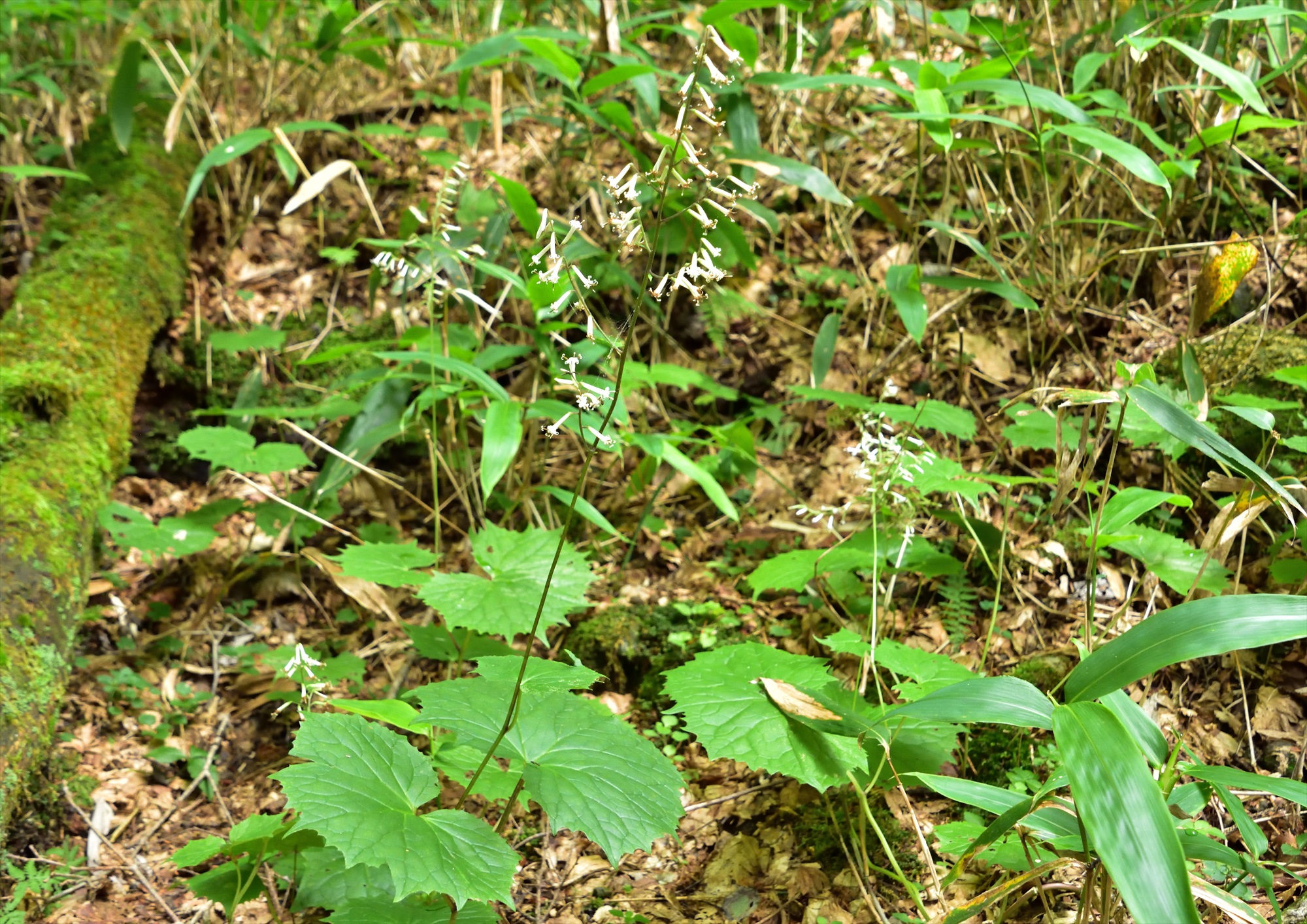 なんと暗い林の中に真っ白いお花畑が!!近づいて見てみるとカニコウモリの花ということがわかりました。