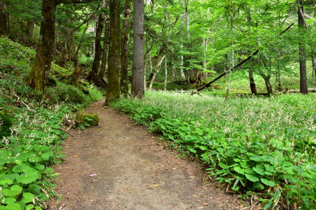 さらに薄暗いコメツガやアスナロなどの針葉樹林の中を歩くので、ひんやりとしてなお森林浴をしながら軽トレッキングを楽しめます。