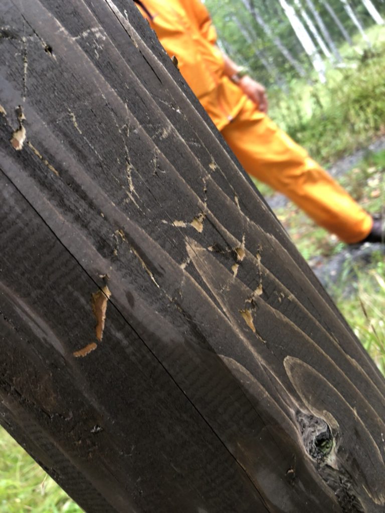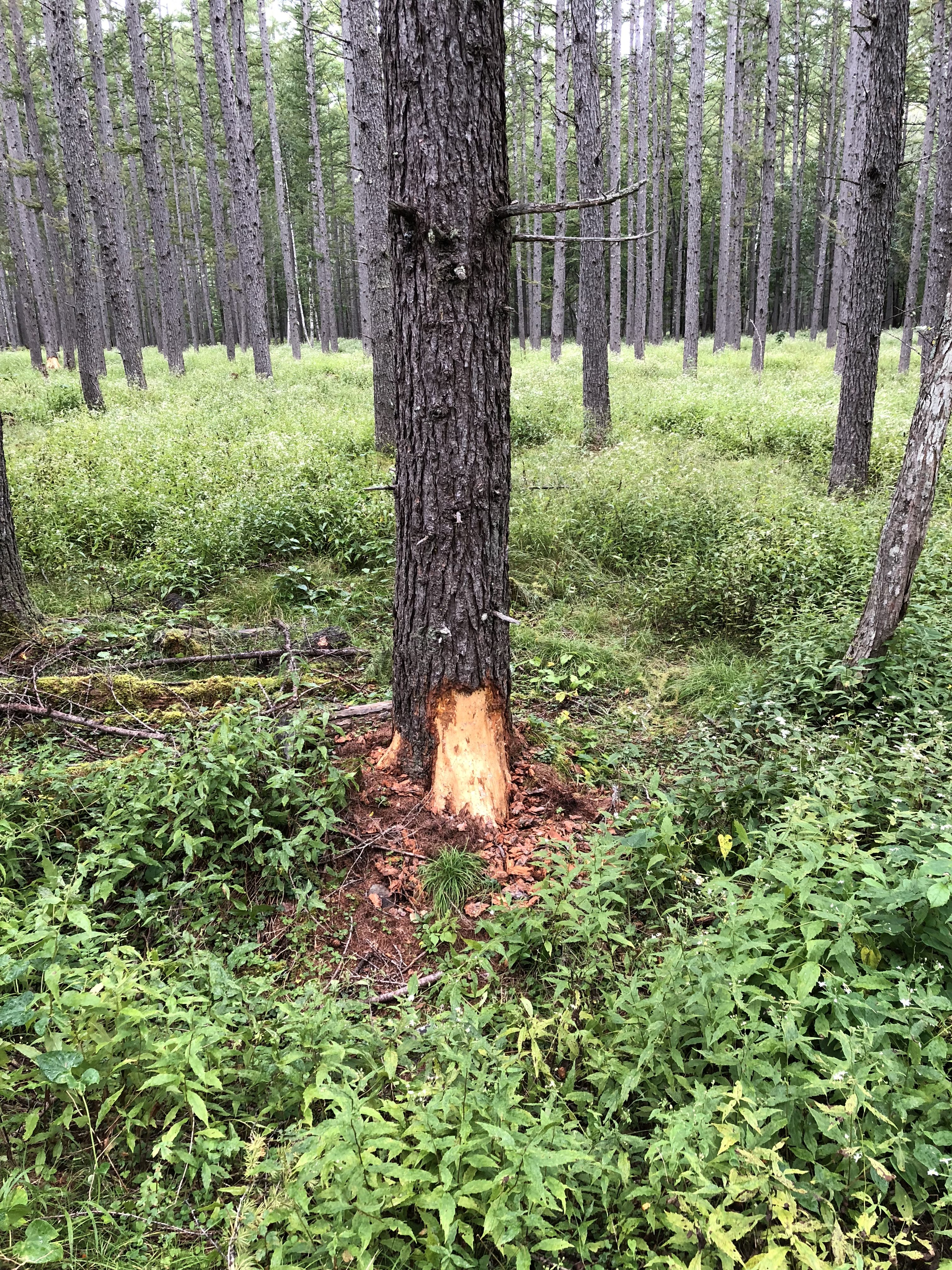 この先にあるカラマツの根元にはクマ剥ぎを見つけました!