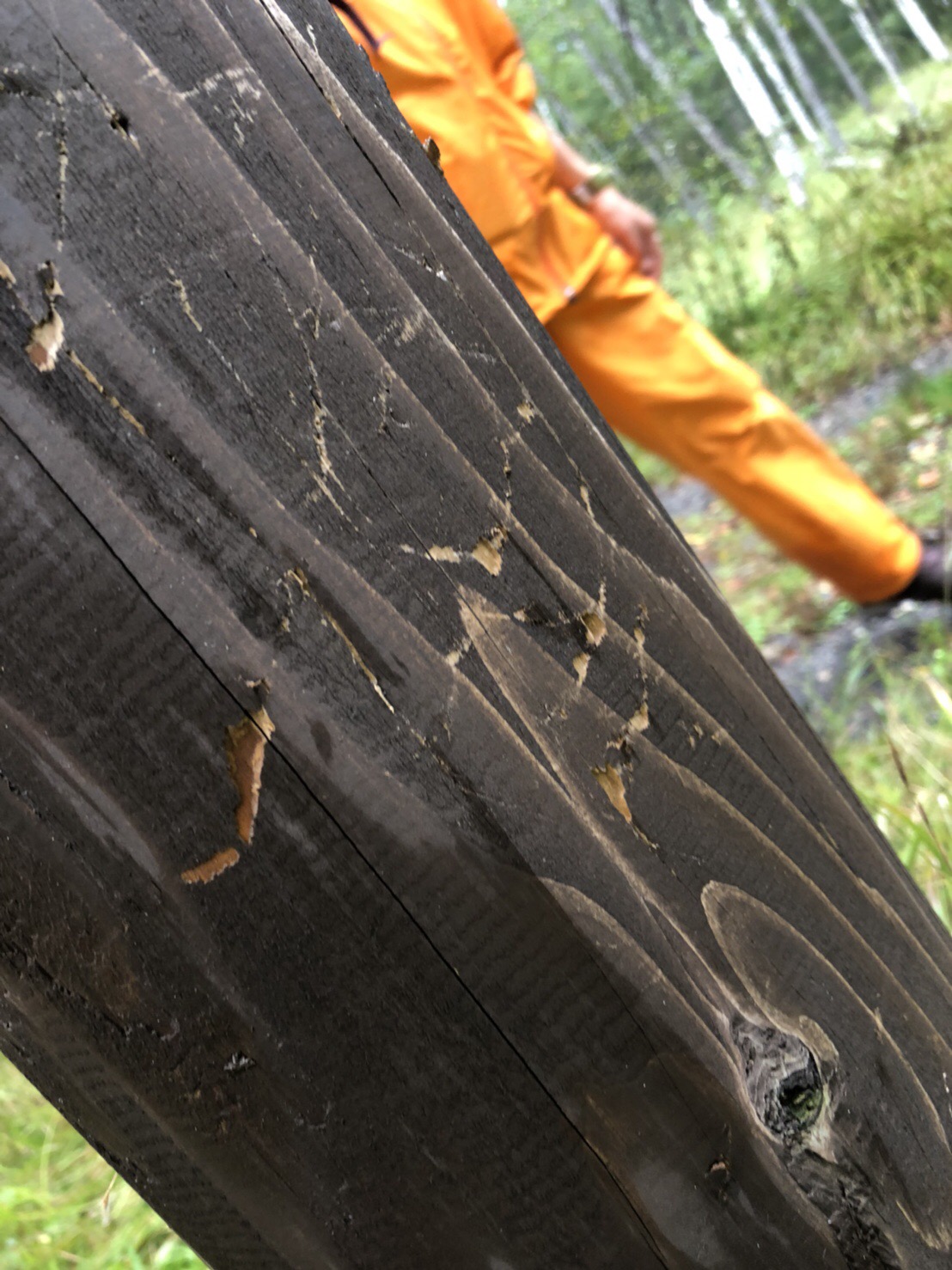 看板の後ろに誰かの爪痕が…