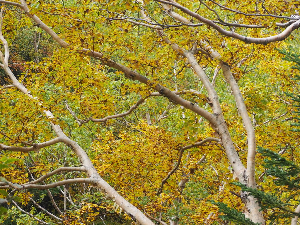 こちらはダケカンバの紅葉。枯れて茶色くなった葉も多く見受けられ、一番の見頃のピークは過ぎてしまった様子です。が、遠目に見る分にはさほど枯れ葉は目立たず、黄色がとにかく目を惹きます。