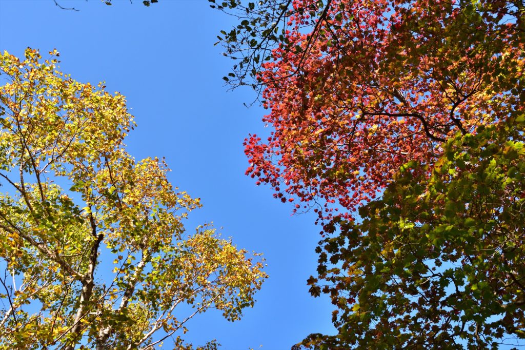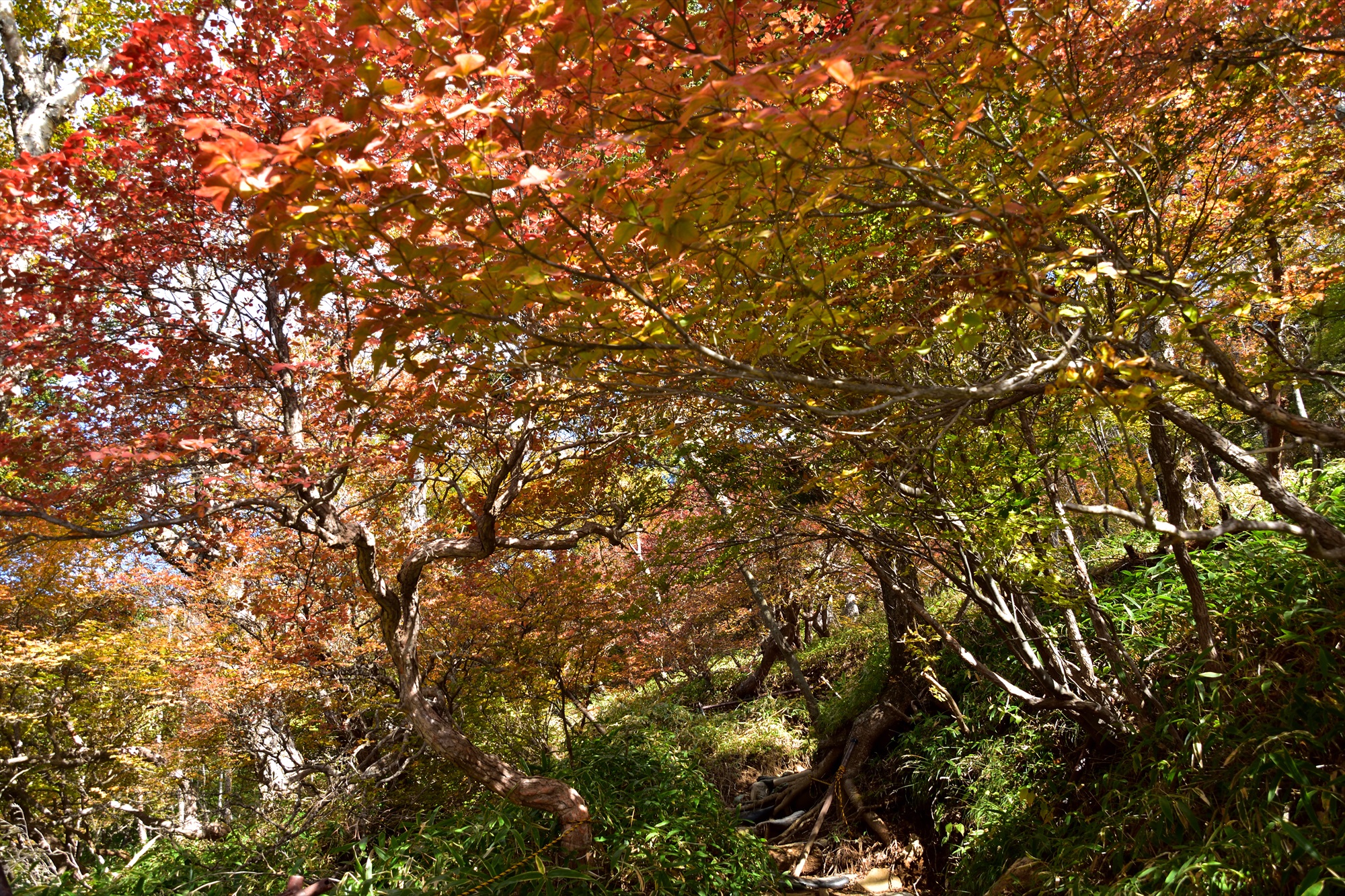山中では4~6合目付近のカエデ類やツツジ類が赤く染まっていました。時にはトンネル状となったそれをくぐってみたり。癒されます。
