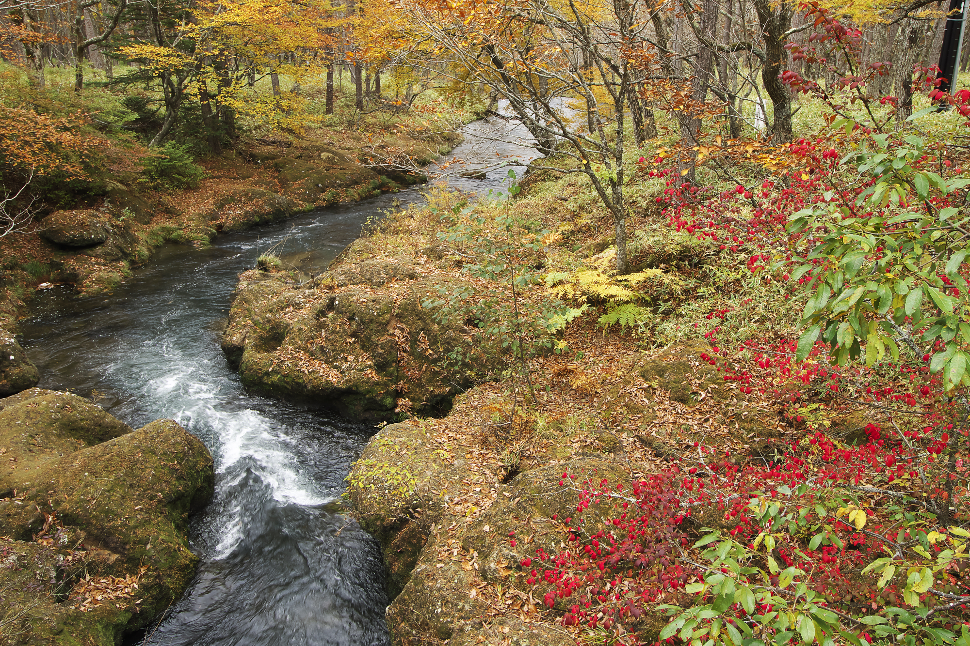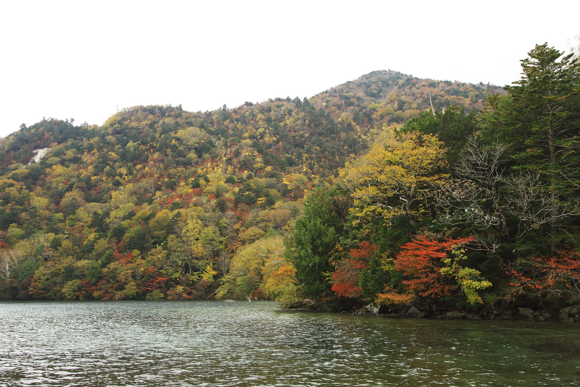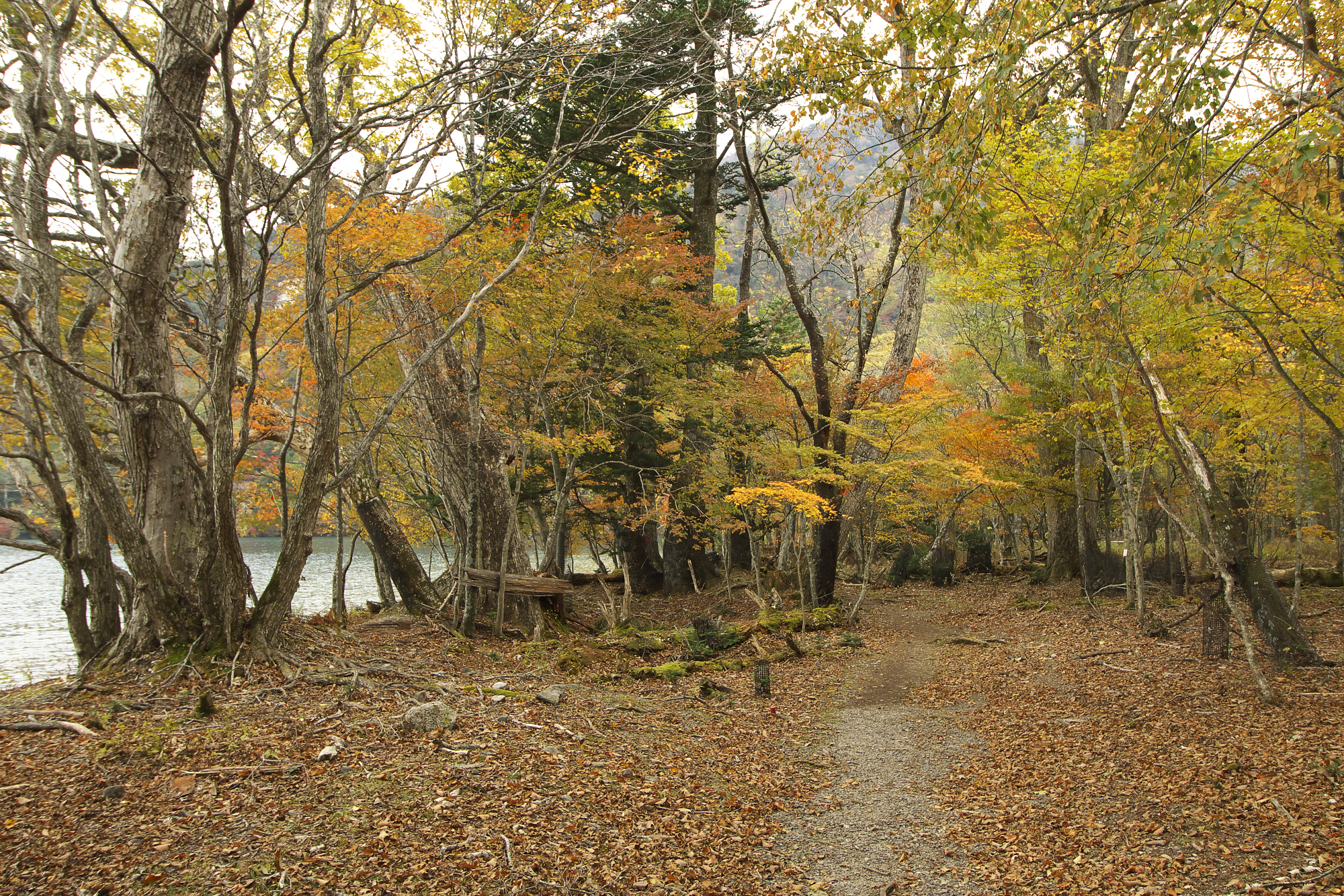 真っ赤になっている一本は奥日光では珍しい(気がする)ニシキギの紅葉。