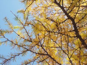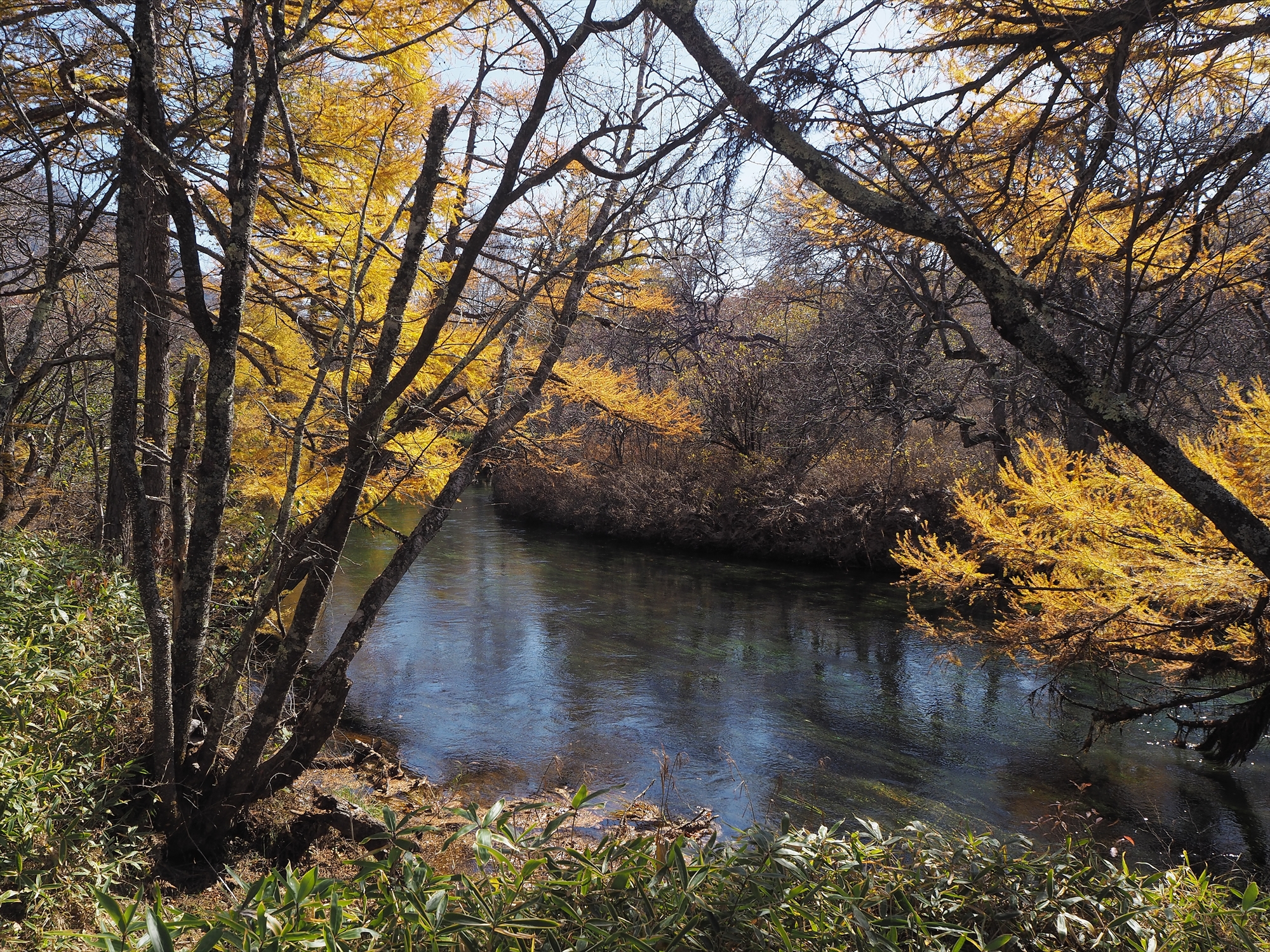 戦場ヶ原の周りと湯川沿いの木道を縁取るのは、カラマツの「黄葉」。このあたりはミズナラ、サクラ類、カバノキ類など、早く紅葉して散る樹木が多いので、今はカラマツイエローが待ってましたと言わんばかりに生き生きと映えています。