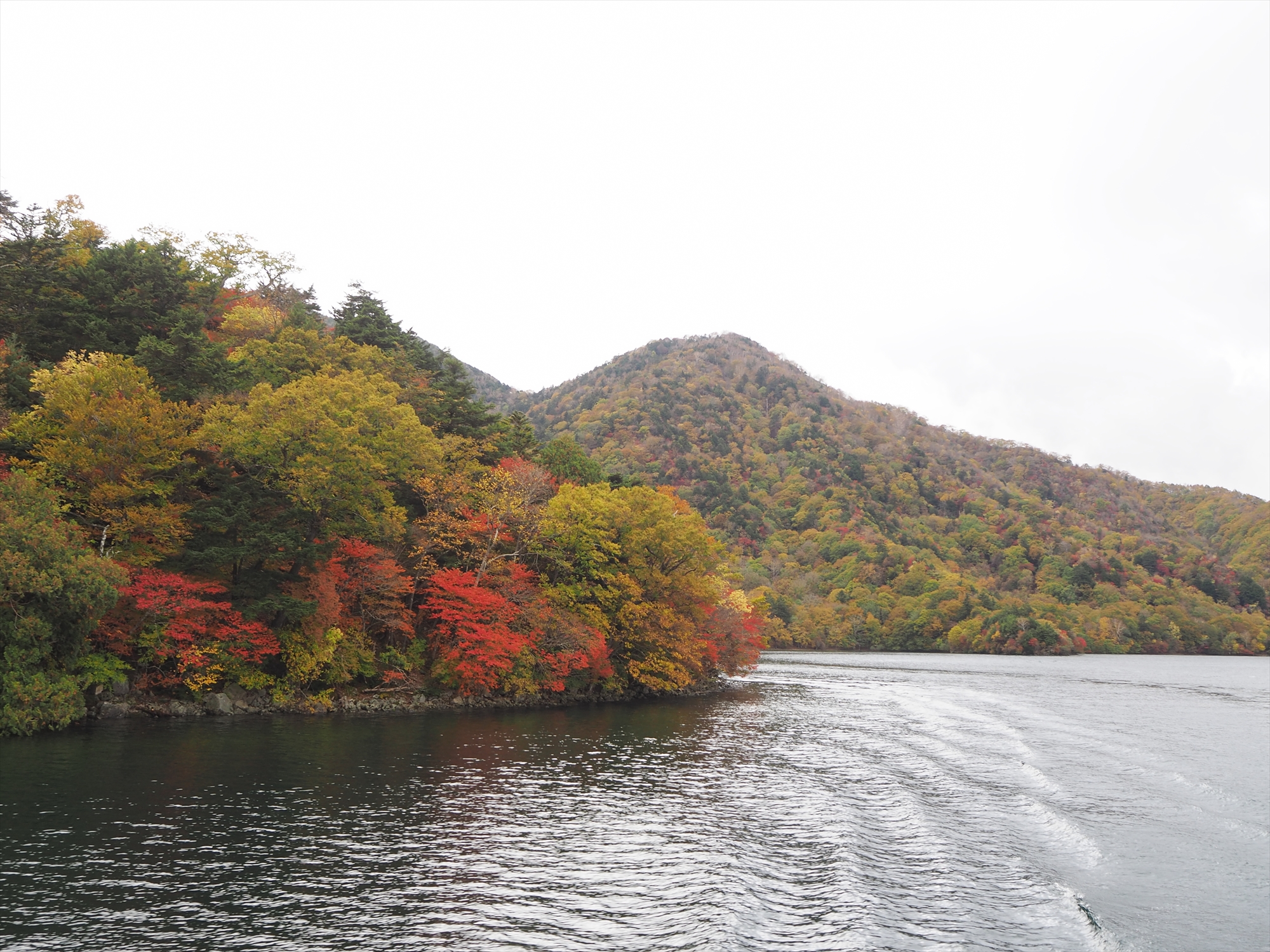 こちらは中禅寺湖機船(←クリックするとHPへ飛びます)からの様子。一昨日の紅葉情報では、半月山展望台から見ると「見頃始まり」というようにお伝えしましたが、湖側からは「見頃」と言っても良さそうでした。