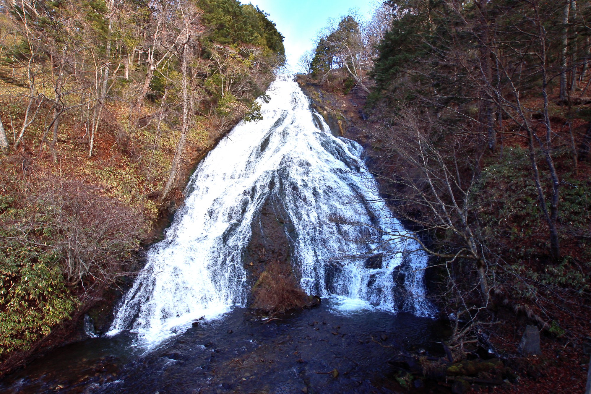 奥日光三名瀑の一つである湯滝も、その周囲に広がる森もすっかり落葉し、