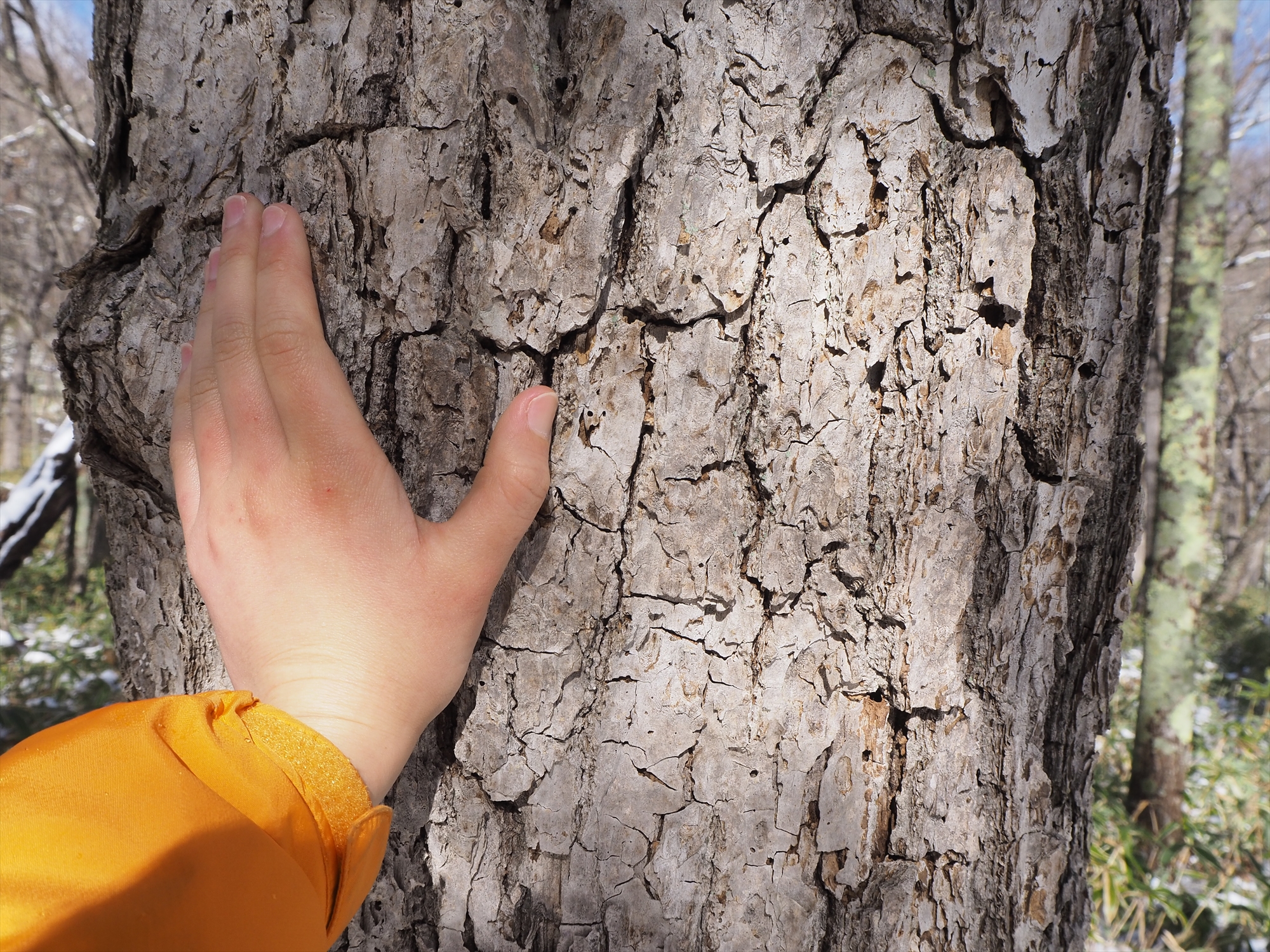 ミズナラやマツ類のガサガサ樹皮も温かく感じるんですよ。すべすべのカバノキ類と比較すると分かりやすいです。厳冬期の私のオススメです。