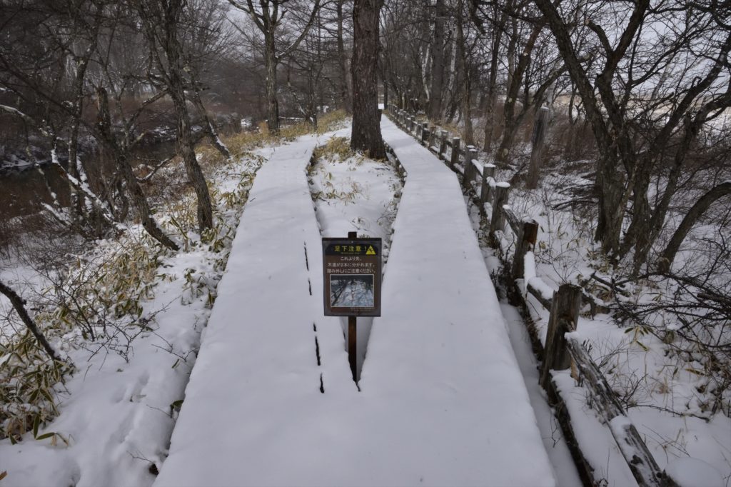 本日歩いた所の積雪状況として、深くても20㎝程度でスノーシューは必要なく、まだスノーブーツなどで歩ける状態です。木道の上に積もった雪の下で凍りついているところもあり、滑ることがあるため注意が必要です。チェーンスパイクがあるとより安心ですね。